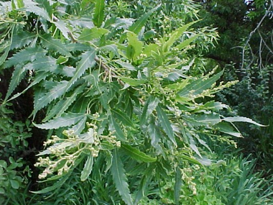 BOTANICAL DESCRIPTION: General: A medium-sized tree, resembling Rhus spp. Leaves: Dark green, leathery with three leaflets. Margins sharply toothed. Sap somewhat milky. Flowers: Small, creamy green, in large loosely branched sprays. All floral parts in fives. November - March. Fruit: Flattened nut with a red papery wing, containing an aromatic oil.