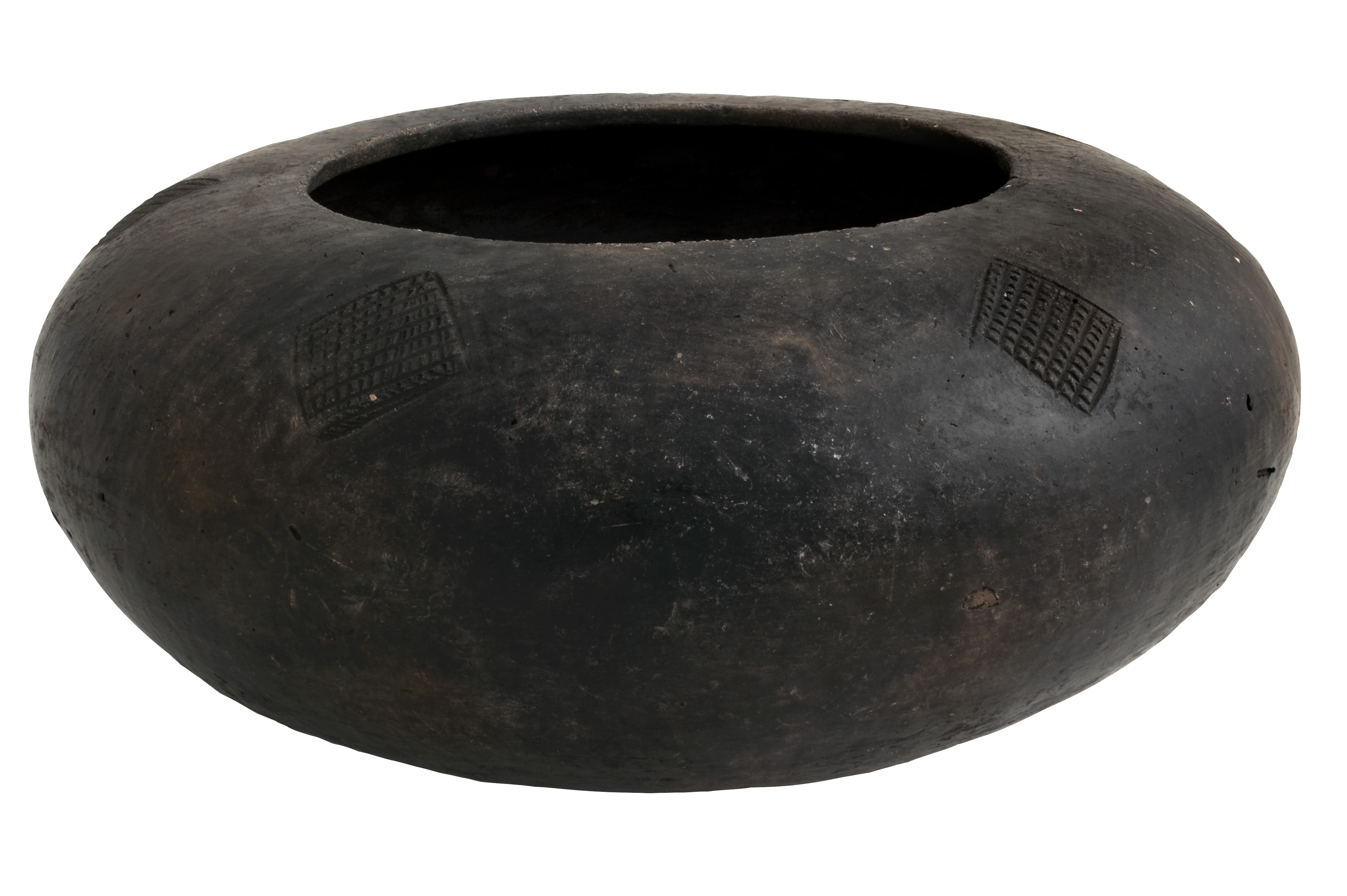 This sub-spherical bowl from Mapungubwe has five deeply incised, crosshatched diamond decorations on the shoulder. The vessel has a smooth finish with black burnish on the exterior. the base is rough in texture as a result of domestic use. There is a squared perforation on the shoulder of the bowl as a result of pitch fork striking.