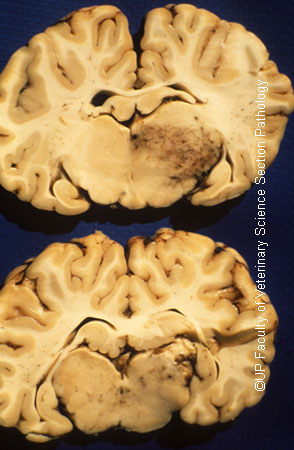 | dc.description.abstract | Turning sickness or cerebral theileriosis is an uncommon aberrant form of infection by Theileria parva or Theileria taurotragi in which lymphoblasts parasitized by schizonts accumulate in cerebral vessels leading to thrombosis and infarction. In the more acute form areas of intense congestion and haemorrhage are present in the meninges and brain which are associated with ares of softening (Infarction) and discoloration of brain tissue. Thrombosed meningeal vessels are often very promiment. There may be severe haemorrhage into the ventricles. | en |