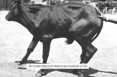 Clinical signs of heartwater in cattle is a fever of 40°C or higher which persits for 3-4 days before it falls to below normal shortly before death. Animals cease eating and a diarrhoea may or may not be present. Some cattle, particularly those of the Jersey breed, develop a profuse, often haemorrhagic, diarrhoea. During the later stages of the disease syndrome nervous signs occur which vary from mild incordination to convulsions. Animals are hypersensitive when handled or exposed to sudden noise. Tapping on the forehead often causes exaggerated blinking. Some animals walk with a high stepping gait or wander around aimlessly and walk into fences. If they fall down they may make "pedalling" movements with the legs.