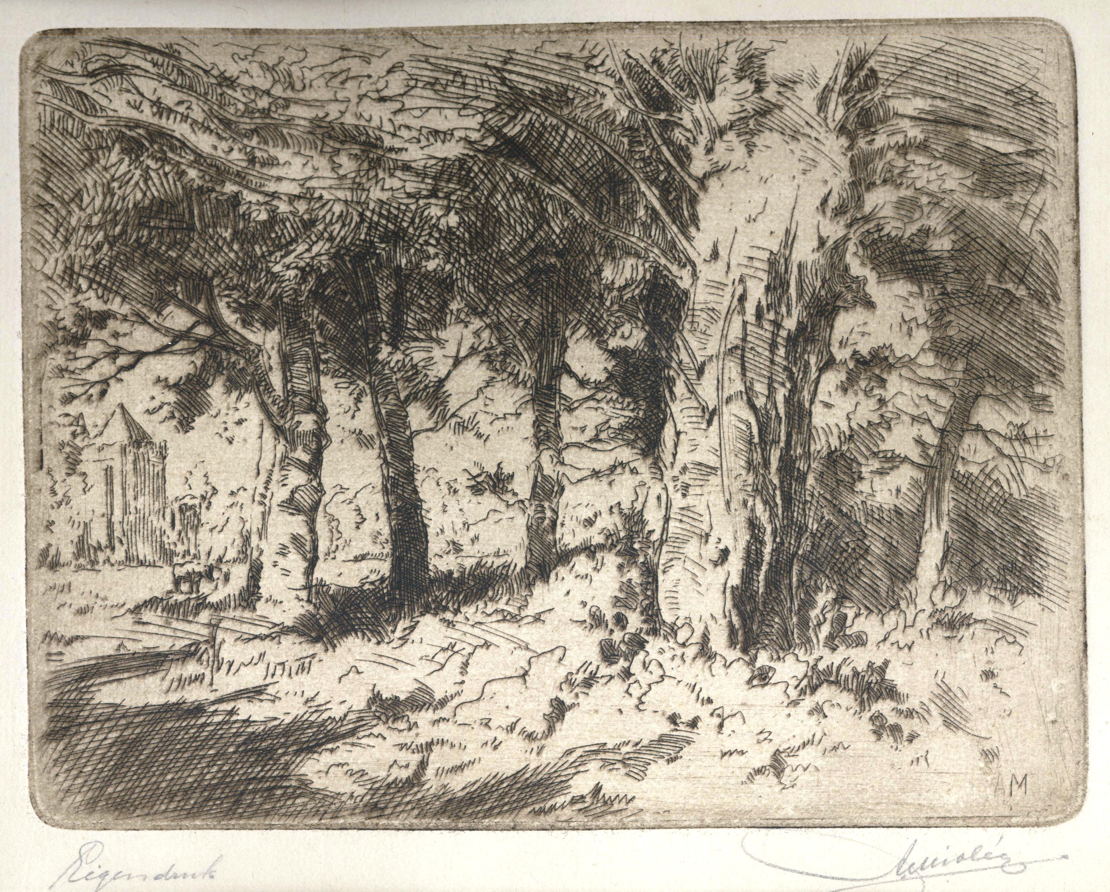 Dry needle etching of the ruins of Brederode. The castle was built in the 13th century by William Brederode in Santpoort-Zuid, Velsen, Noord Holland. Signed by artist in pencil, monogram "AM" printed and "Eigendruk" inscribed bottom left.
