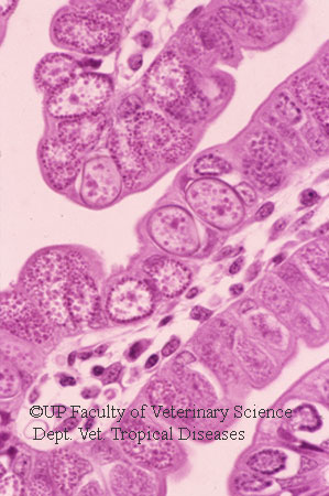 Species of the genus Eimeria are the most important causes of an important protozoal diseases known as coccidiosis which occurs in many livestock species like cattle, sheep, goats, horses, other mammals and poultry. In livestock the frank disease is characterized by enteritis and diarrhoea following invasion of mucosal cells of the gastrointestinal tract by the parasite. Subclinical infections are common. The developemntal cycle of the parasite in the host occurs intracellularly, while the final form, known as an oocyst is, in domestic animals, passed out to the external environment in the faeces. Oocysts of the genus Eimeria develop into four sporocysts at sporulation, each of them containing 2 sporozoites. If susceptible domestic animals ingest sporulated oocysts, the sporozoites are released through the action of digestive juices and then, depending on the parasite species, enter epithelial or other cells of the mucosa of the gut where they undergo asexual and sexual stages of their life cycle. (Source: Coetzer, JAW & Tustin, RC. 2004. Infectious diseases of livestock. Cape Town, South Africa : Oxford University Press.)