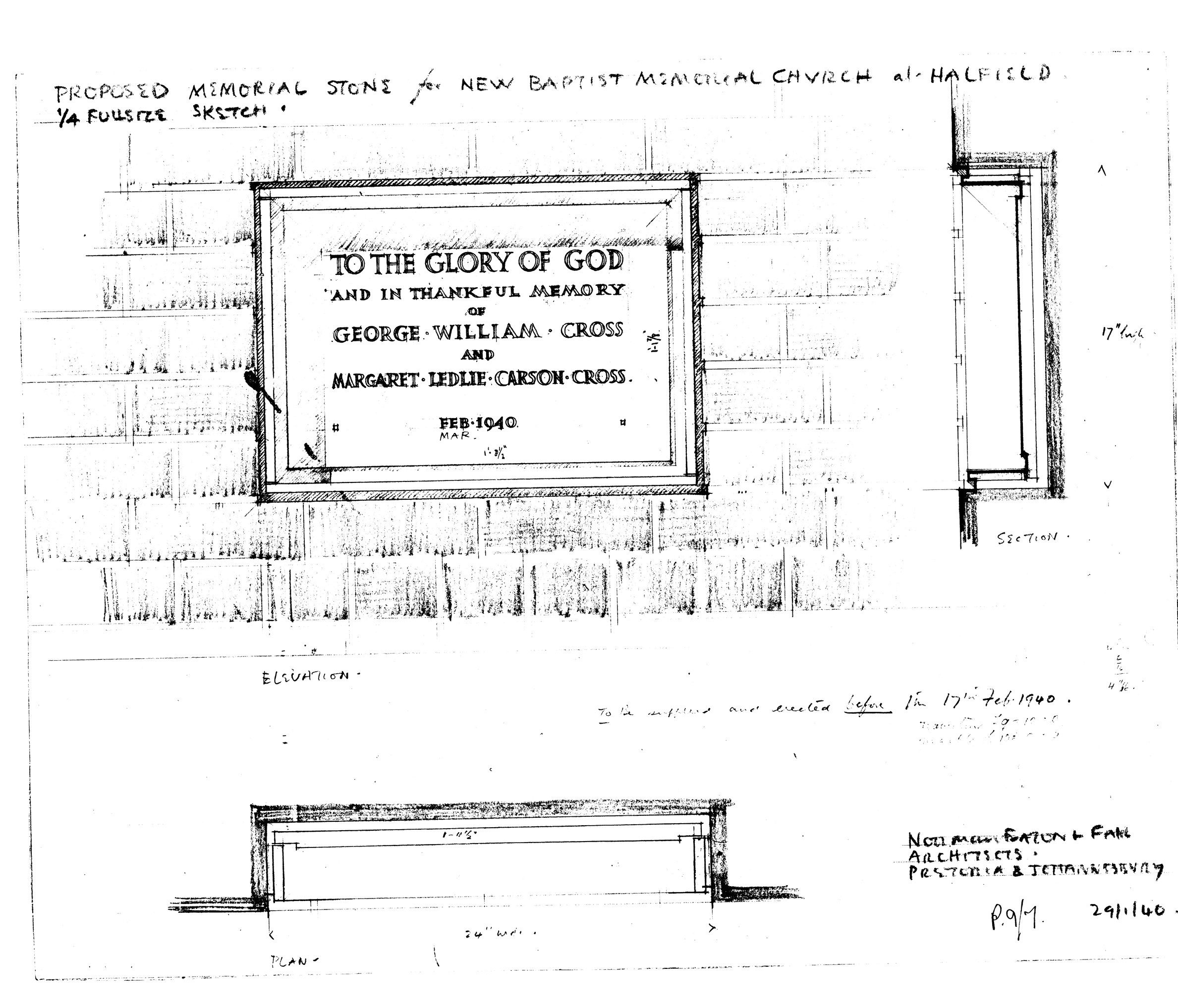 Proposed memorial stone for new Baptist Memorial Church at Hatfield