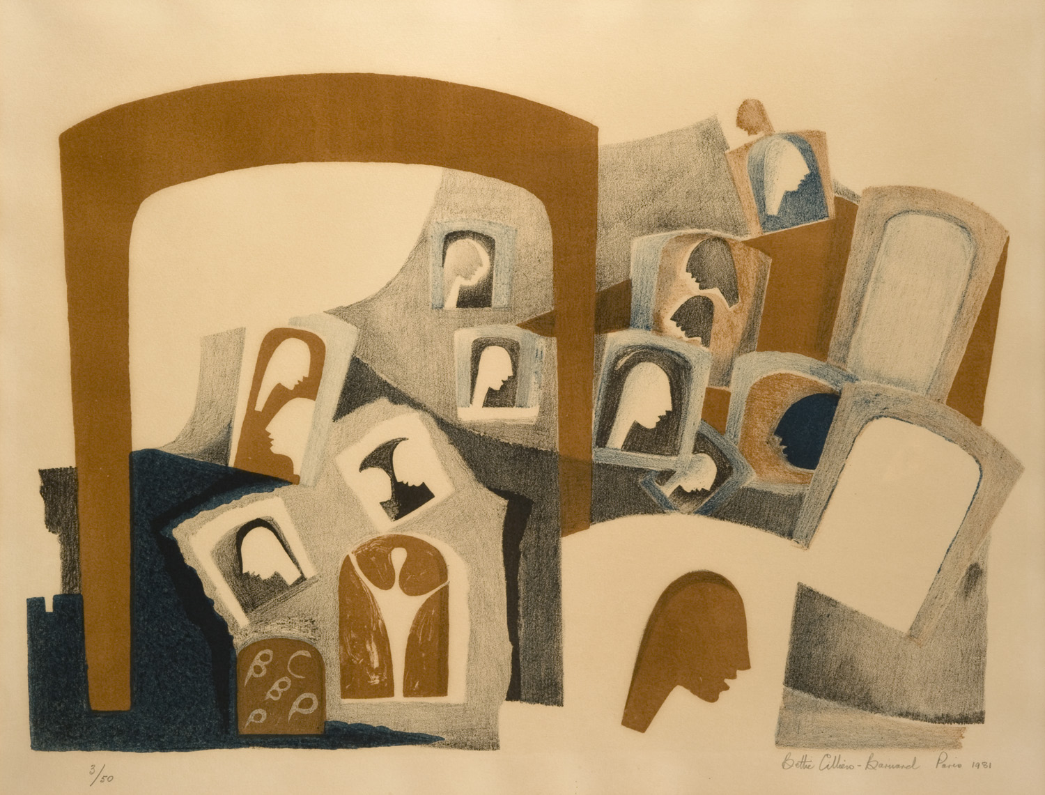 This lithograph is one of the nine lithographs which Bettie Cilliers-Barnard created in the studio of Jean-Paul Pons in Paris between March and May in 1981. Each lithograph was created in three colours with human figures and heads as the main symbolic forms. Also quite prominent is the arched gateway (“poort”), profiled heads in silhouette and the rectangular shapes.