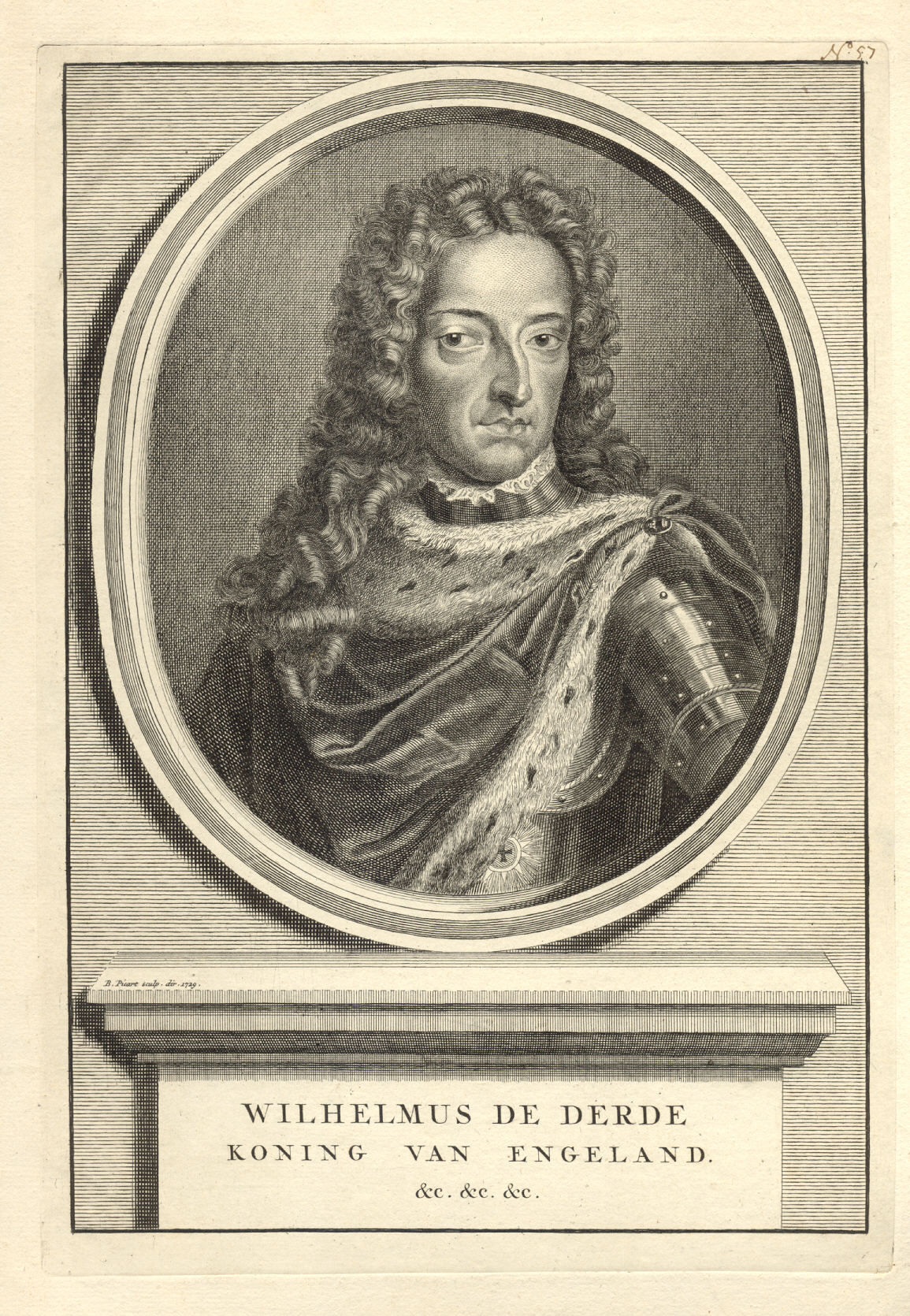 Copper engraving of oval portrait of Willem III, Inscribed "Wilhelmus de Derde koning van Engeland &c. &c. &c." signed "B Picart sculp dir 1729"