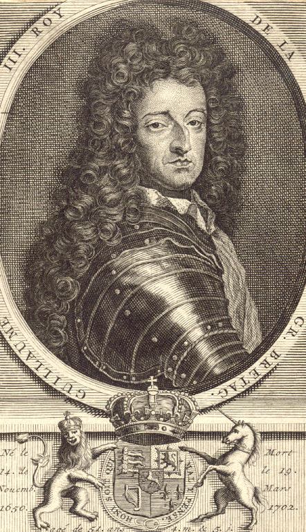 Copper engraving of oval portrait of Willem III in armour. Inscribed on oval portrait "Guillaume III Roy de la Gr. Bretag". Underneath portrait the royal coat of arms of England with the birth and death dates of Willem III in French.