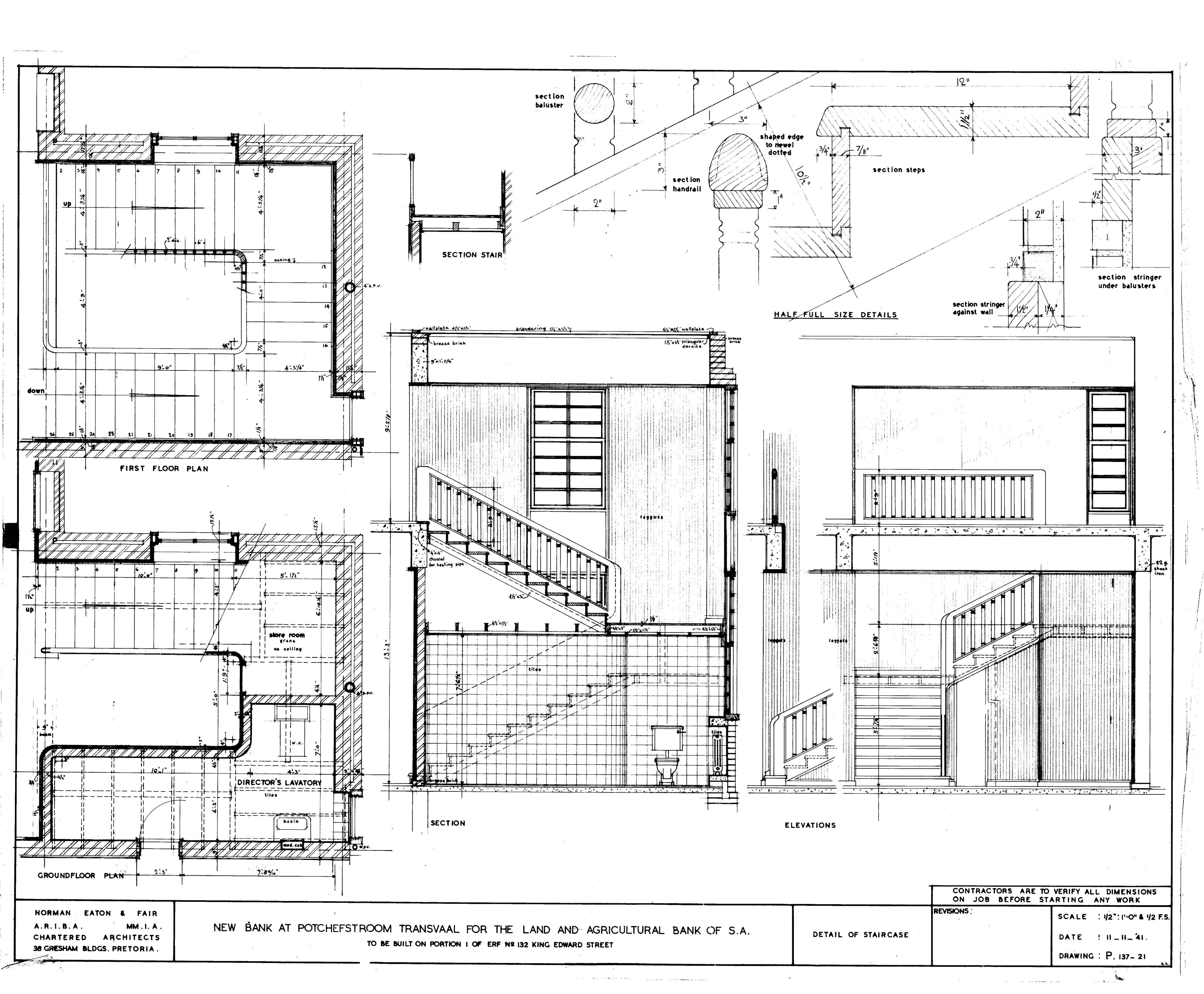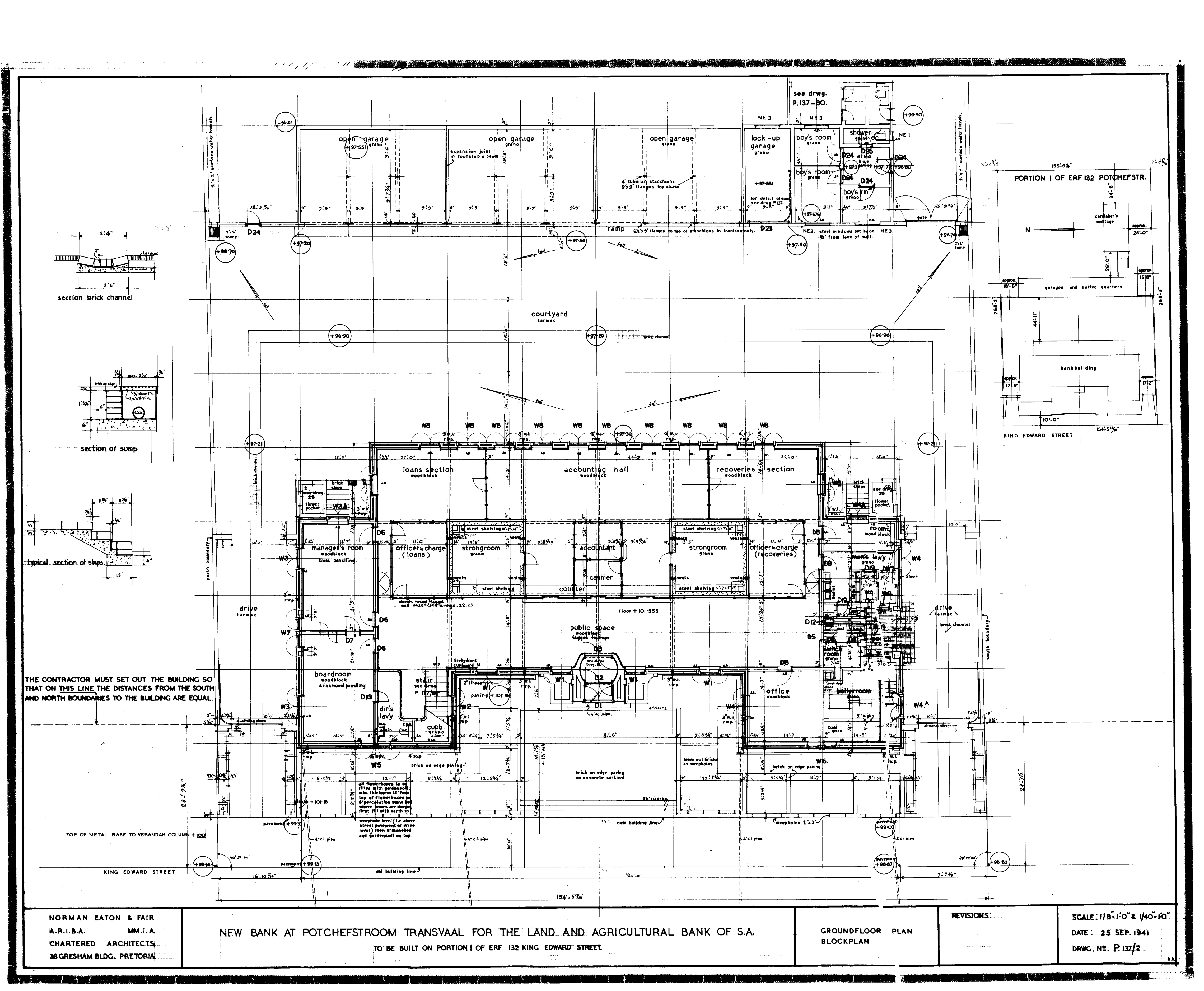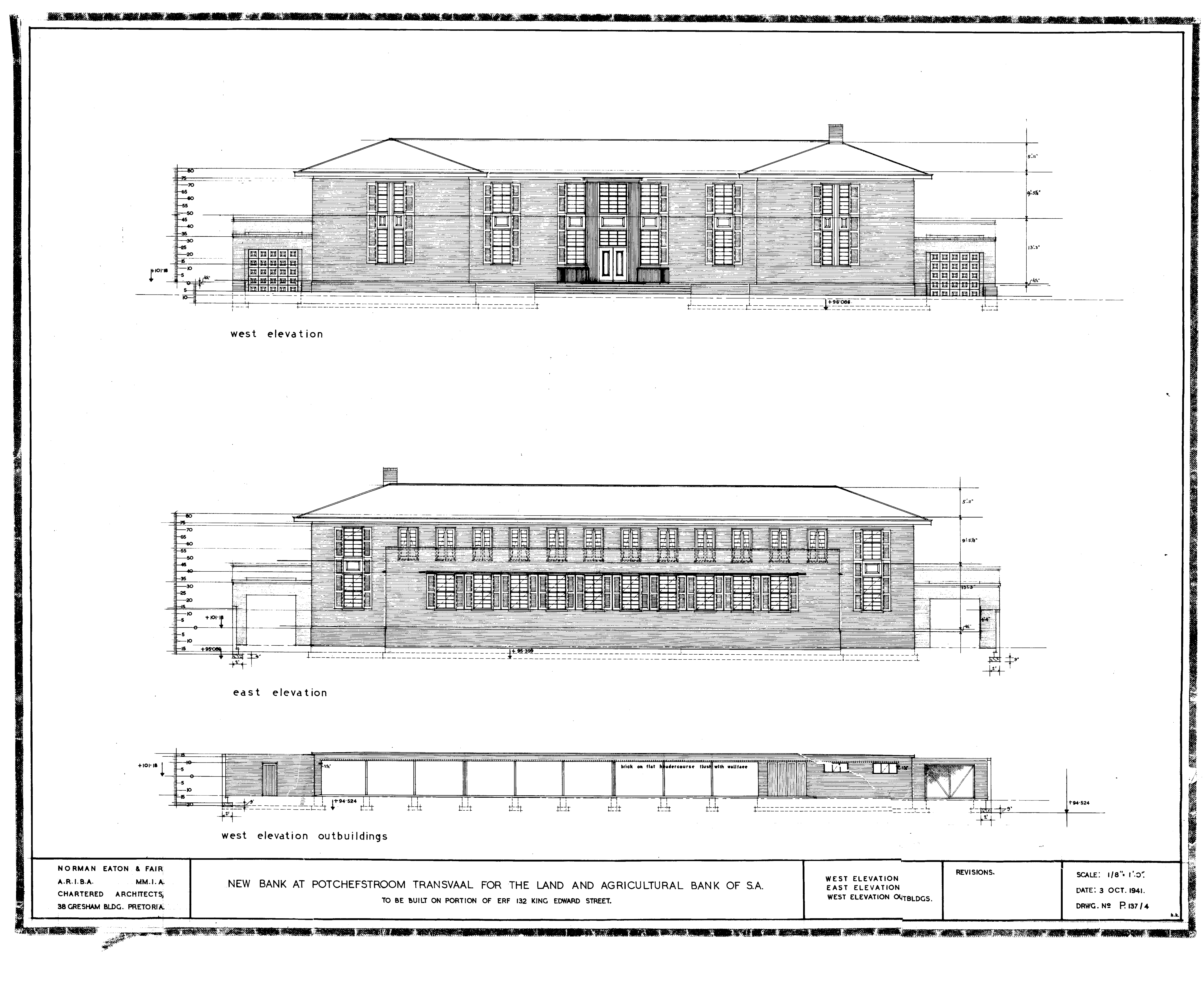 5 plans numbered 07080-01 to 07080-04 of the new building for the Land and Agricultural Bank of S.A. in Potchefstroom
