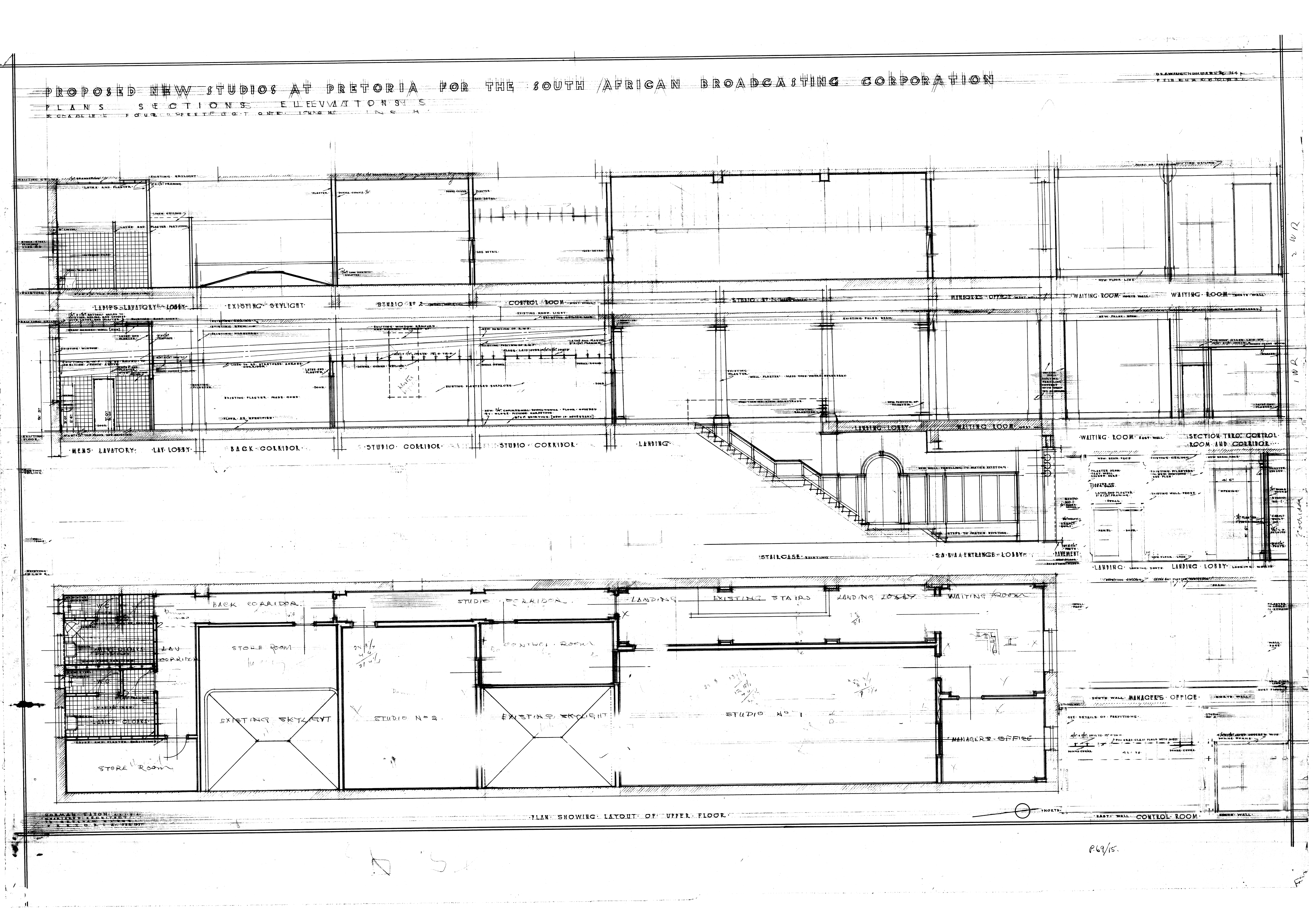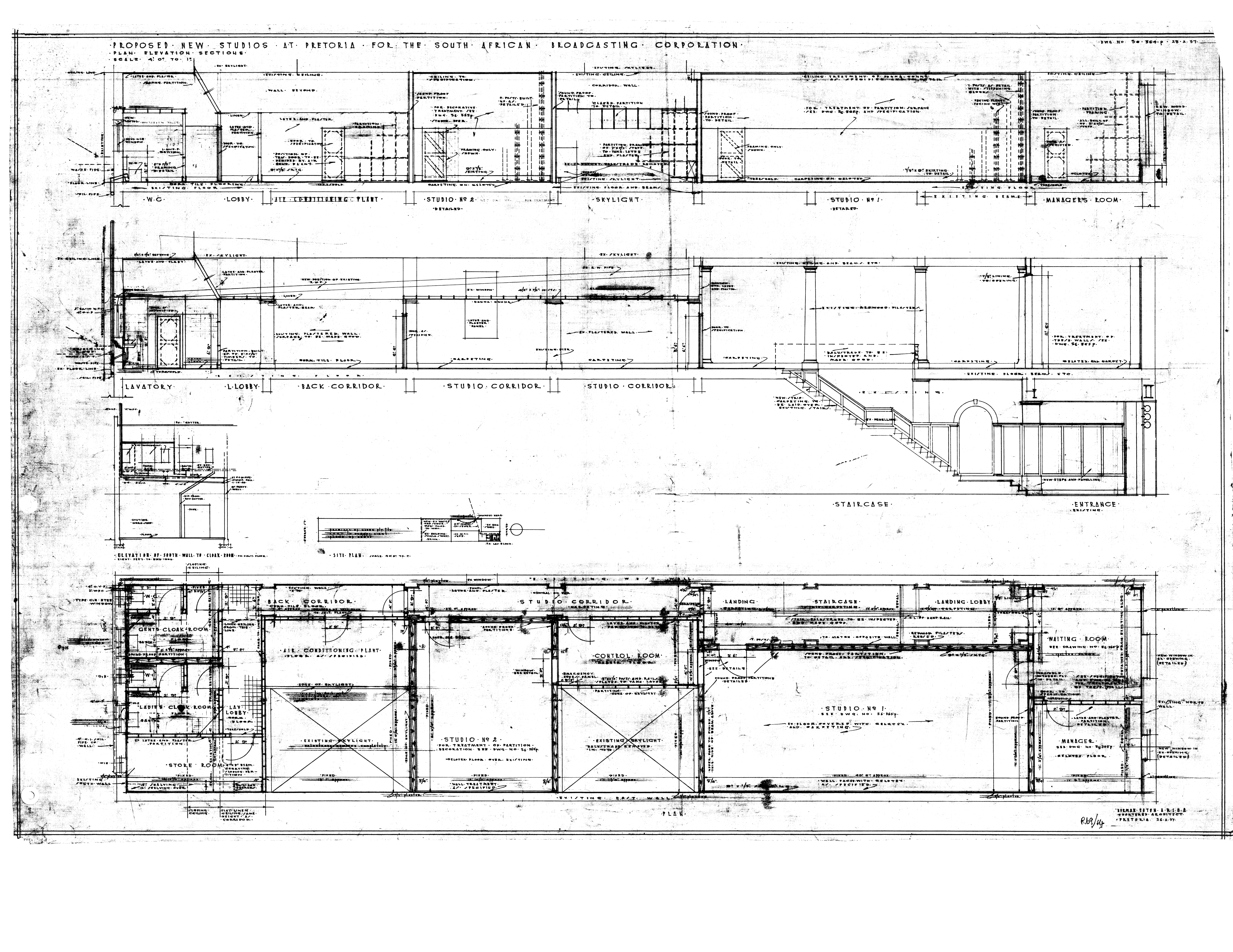 Plans, sections and elevations of proposed new studios at Pretoria for the South African Broadcasting Corporation (SABS).