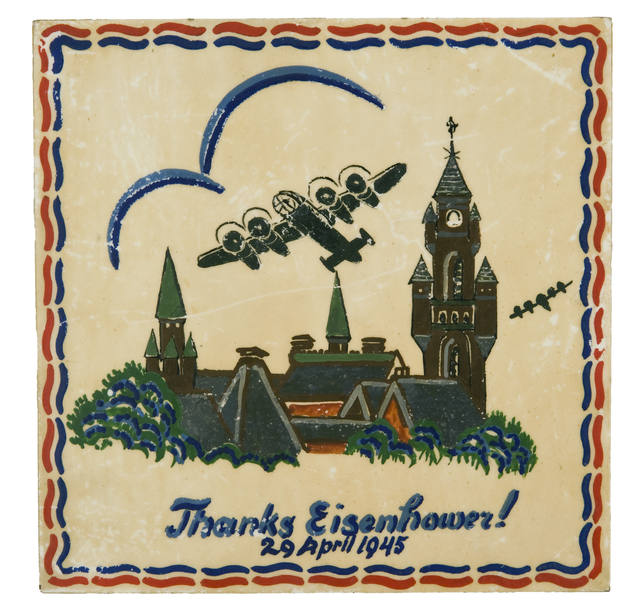 This square white tin-glazed tile is hand-painted with a townscape with two Avro Lancaster bombers in the sky and a inscription below “Thanks Eisenhower! – 29 April 1945”. On 29 April 1945 the Allied forces moving towards Munich liberated the Dachau concentration camp. The town on the tile can be identified as Dachau and the inscription thanks the American general Eisenhower for the liberation.