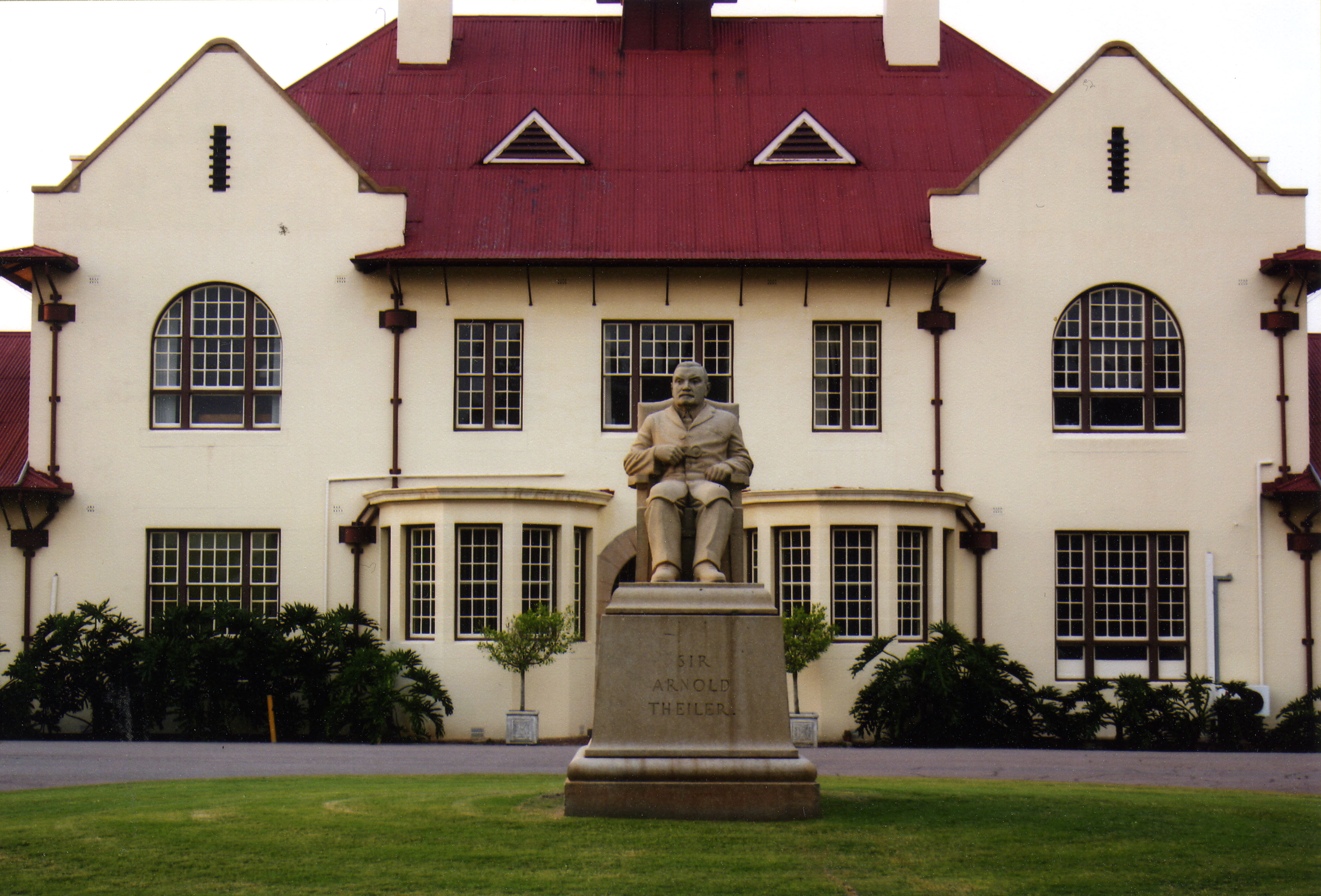 Main building at the ARC Onderstepoort Veterinary Research and Biotechnology Platform (formerly Onderstepoort Veterinary Research Institute) with the statue of Sir Arnold Theiler