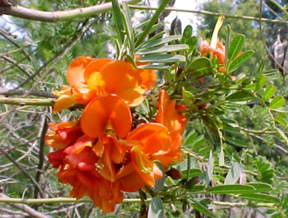 BOTANICAL DESCRIPTION: General: A deciduous shrub or small tree. Leaves: Drooping, compound dark green leaves. Flowers: Red or orange pea-like flowers in dense sprays. Spring - early summer. Fruit: The seeds are carried in a characteristic long four-winged pod with a sharply pointed tip.