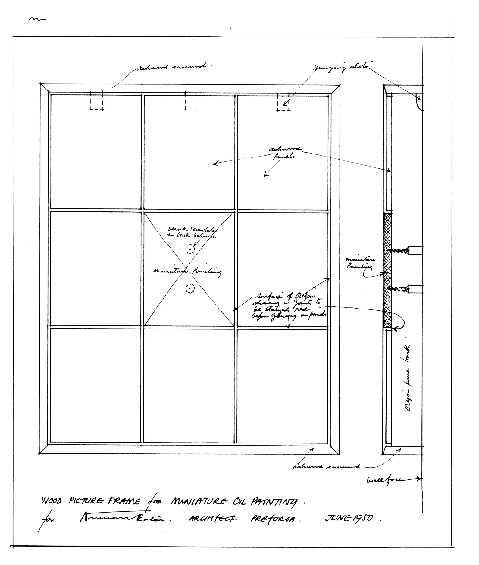 2 designs entitled Wood picture frame for miniature oil painting, and full size section through rectangular picture frame in quince wood ... ; dated 1950 and 1948 respectively.