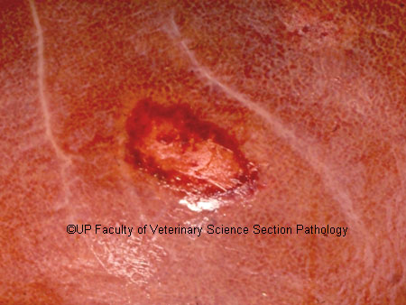 - Photo 3: Rumenitis in bovine. Focal haemorrhage and necrosis on serosal surface of rumen (PM150/93)
