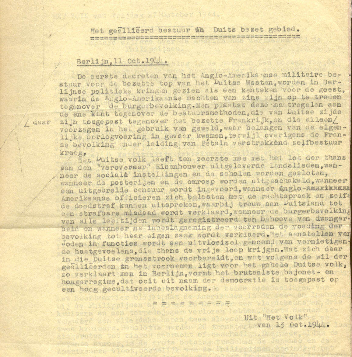 Out of the newspaper "Het Volk" 13 October 1944. Original size 285mmX225mm on yellow paper. Scanned on HP5300C scanner at 150dpi. 1 page.