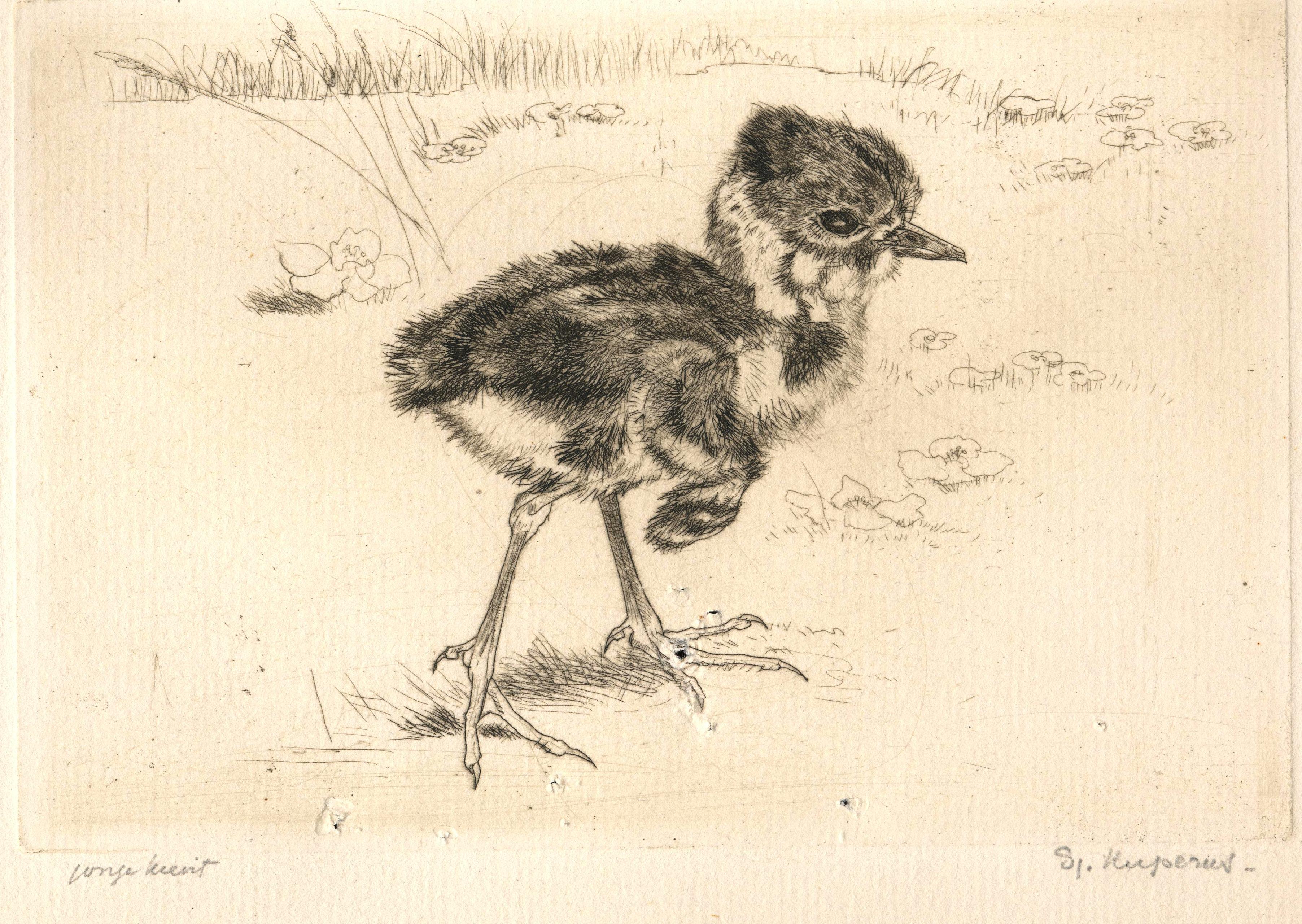 Between the years 1921 and 1958, Kuperus drew and etched animals in the Amsterdam Zoo. In 1936 the birth of a young lapwing (kievit) was reported at the zoo in several newspapers. At least one of these newspapers mentioned an artist for the zoo drawing the young bird.