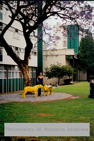 Female student standing next to the mascots of Klaradyn female residence, University of Pretoria