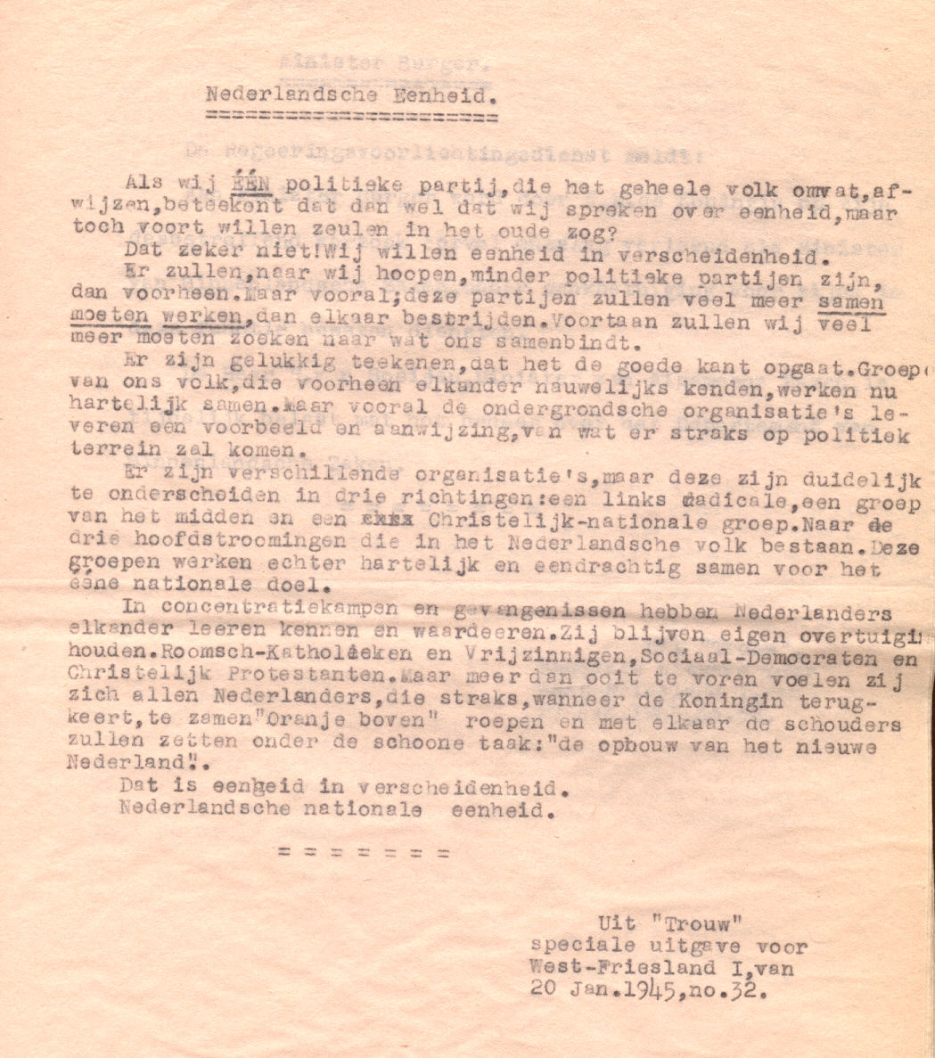 Out of the newspaper "Trouw" special edition for West-Friesland, 20 January 1945, no 32. Original size 285mmX225mm on pink paper. Scanned on HP5300C scanner at 150dpi. 1 page.