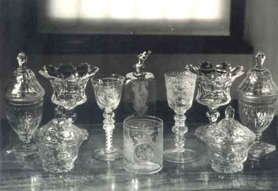 From the Pearse Collection: photograph depicting a symmetrical arrangement of various glass objects. From the centre: a flask-like object with an early V.O.C. beaker in front; two engraved wine glasses, the one to the left belonging to Mr. William Fehr of Cape Town (see pages 190 and 191 of "Eighteenth Century Furniture in South Africa" by G.E. Pearse) having an air-twist stem with three knops above, and the one to the right having multiple knops; two stemmed sweetmeat dishes (probably 19th century); a covered, facet-cut sugar bowl (?); and a goblet and cover with finial. The last could also be a sweetmeat dish of a later date.