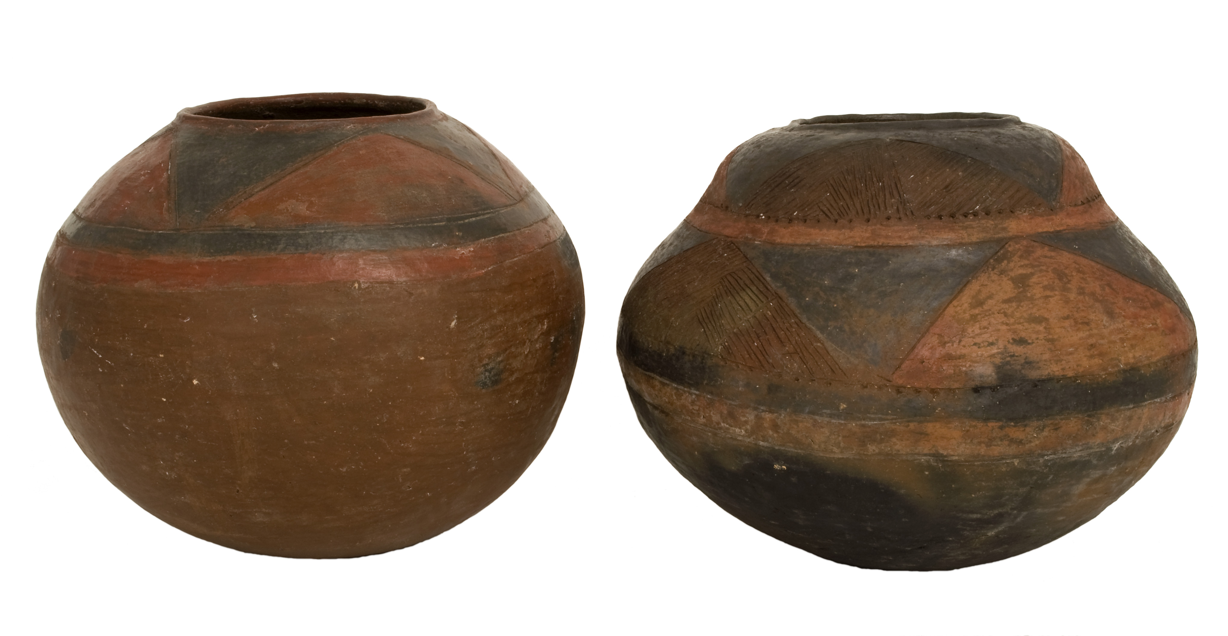 Two domestic functional traditional Venda pots decorated with iron oxide powder and graphite over a terracotta body and rounded rims. The decorations on the shoulder are traditionally geometric in form and design, with interspersed with graphite. Both vessels are shaped by hand from raw clay to form round bodies, with the one vessel taking on a gourd shape. They are both low fired in an open pit, decorated with ochre pigment and graphite burnished onto the exterior surface for decoration, resulting in a smooth, high gloss undulated surface.