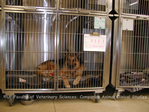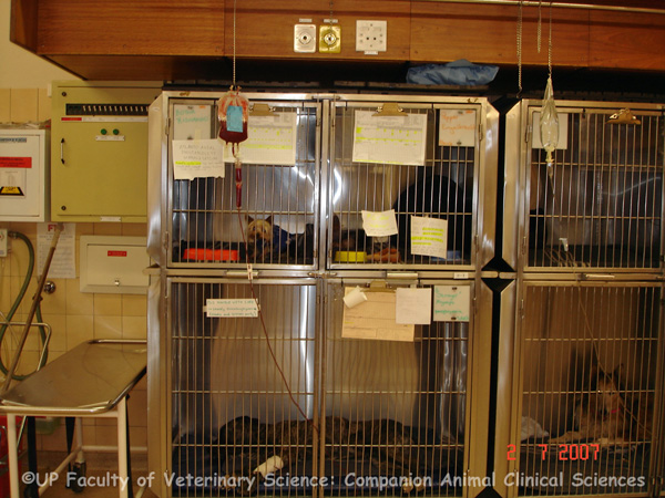 PHOTOS 1-4: Hospitalized animals must be housed in cages that are secure and comfortable. There should be no sharp edges so the patient cannot hurt itself. The cage should be large enough so the animal can move and turn around. Many critically ill animals may have problems maintaining normal body temperature and need an external heat source. A heating mat can be placed on the floor of the cage so the animal is comfortably warm. Hospitalized animals can develop hyperthermia from heating pads and this should not be confused with true fever. Stainless steel cages should be used and should ideally be placed against the walls of the ward. The cage door must be able to close securely to prevent escape of the patient. Cages must be kept clean and cleaned and disinfected between patients. PHOTO 5: ICU cages should be comfortable and safe for the patient. There should be clear notices of the treatment and special needs of the patient on each cage. Monitoring of patients in the intensive care unit is critical. The cages may be placed on top of each other in rows and adequate space should be allowed for therapeutic and monitoring equipment. PHOTO 6: Oxygen cages are useful for controlling oxygen concentration, temperature and humidity and allow animals to ventilate without assistance. Inspired oxygen concentration of 30-40% is recommended for animals that need oxygen therapy. If the oxygen concentration is too high it can cause oxygen toxicity. Oxygen cages provide a sealed environment, where the fraction of inspired oxygen, humidity and ambient temperature can be controlled and monitored and carbon dioxide can be removed efficiently. Oxygen cages with a Plexiglas front allow observation of the patient, these oxygen cages also have access ports for entry and exit of intravenous lines and monitoring leads. The advantage of using oxygen cages is that it is a non-invasive way of providing oxygen support to critically ill patients. A disadvantage is that oxygen is lost each time the door of the cage is opened. The amount of oxygen lost each time the door is opened and the amount of oxygen needed to fill the cage makes the use of oxygen cages relatively wasteful and expensive.