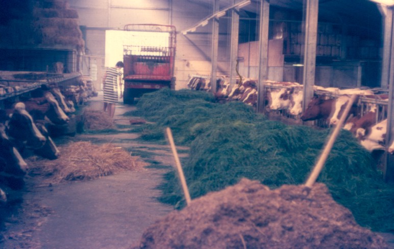 Free-stall barn on dairy farm in Belgium. Dairy cattle feeds on green chop and dry silage.