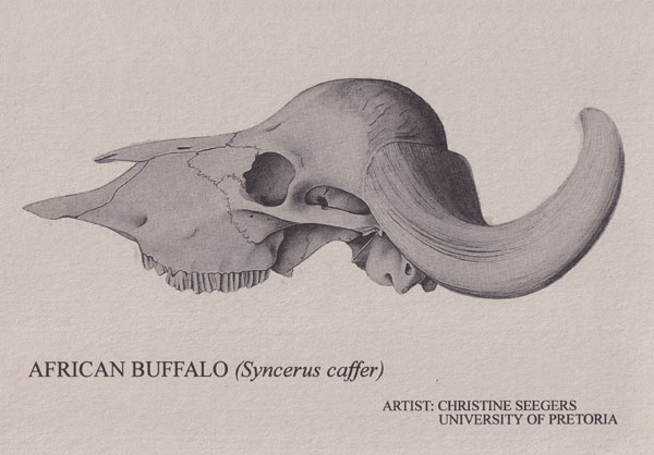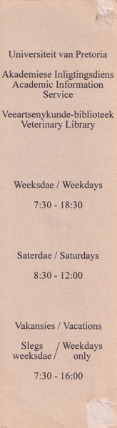 Postcard and bookmark created for the Veterinary Science Library to promote services and operating hours. The artwork of the African buffalo is from Christine Seegers, one of the few biomedical artists in South Africa. She made a large collection of biomedical illustrations of wild and domestic animals while she was employed in the Department of Anatomy of the Faculty of Veterinary Science, Onderstepoort from 1969/10/01 - 1999/10/01