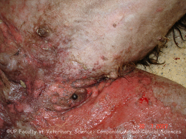 | dc.description.abstract | PHOTOS 1-5: Neoplasia of the skin and subcutaneous tissues are the most common tumours affecting dogs and there are several different types of neoplasia found in skin. Skin tumours are usually classified histologically as there are so many cutaneous structures that could be involved. Tumours are classified according to the tissue of origin and the level of malignancy. Mast cell tumours are the most common type of cutaneous tumour found in dogs. Schnauzers, Boston terriers and Labrador retrievers are some of the breeds that are predisposed to mast cell tumours. Cutaneous mast cell tumours arise from mast cells in the dermis and subcutaneous tissues. These tumours are often infiltrative and metastasize easily to bone marrow and other organs. Undifferentiated mast cell tumours are big, rapidly growing, ulcerated lesions. Hair loss and erythema are common. Mast cell tumours are diagnosed via fine needle aspiration cytology. Rowmanovsky and rapid haematologic type stains are used. Treatment is via surgical excision, radiation therapy or external beam radiotherapy. Poorly differentiated, metastatic mast cell tumours are fatal if there is not effective post surgical treatment. PHOTO 6: Eyelid neoplasms are common in older dogs and are usually benign. Eyelid masses can be resected but the eyelid structure must be restored after excision to maintain long-term ocular surface health. If the structure of the eyelid is damaged it may cause corneal exposure, irritation and ulceration. The most common eyelid neoplasms are sebaceous gland tumours, papillomas and melanomas. Papillomas are more common in younger dogs. Ocular papillomas may have papovavirus aetiology. Eyelid masses that are rapidly growing and ulcerated or are associated with corneal irritation should be resected as soon as possible. Histologically malignant eyelid tumours rarely metastasize and most eyelid tumours are histologically benign. Prognosis for most eyelid tumours is good as metastasis is rare and recurrence rates are low. | en |