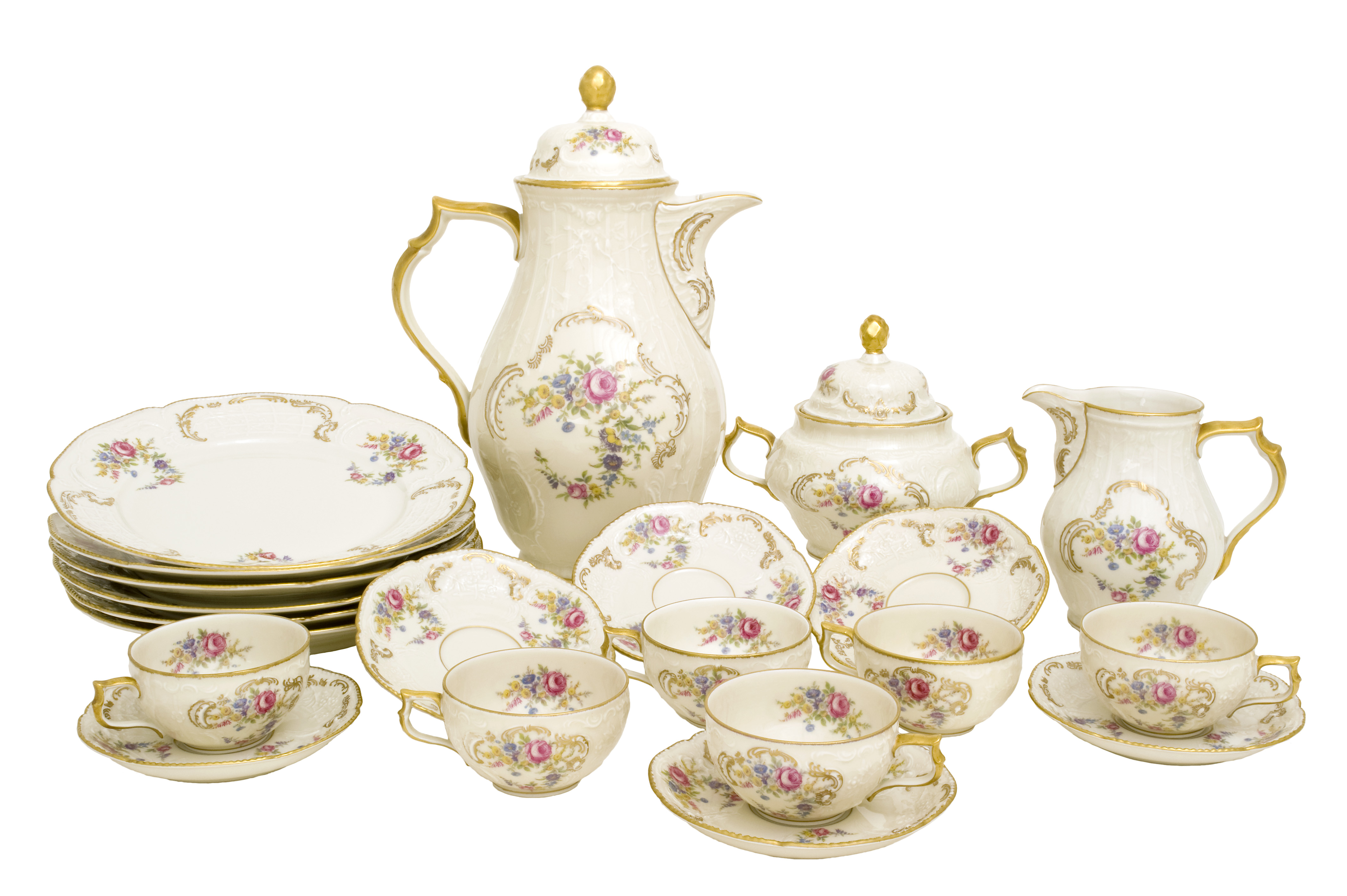This twenty-one piece porcelain tea set was made after the Second World War to the original sanssouci pattern by Rosental in the US Zone. The moulded cups, saucers, kettle, sugar pot and milk jar are decorated with polychrome and gold flowers in panels.