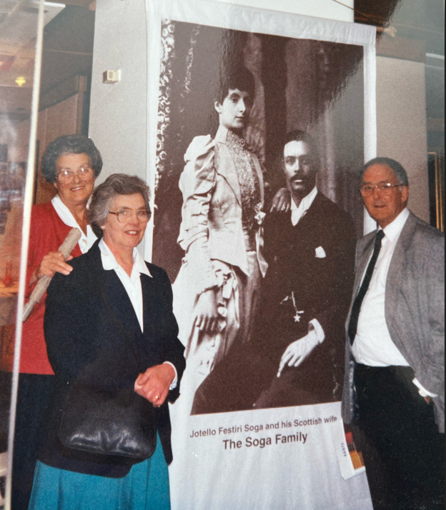 Photo of Jotello F. Soga's grand daughters Jean Duncan and Pat Thomson's dad, William Duncan and his two sisters Doris and Cathy standing in front of a poster of Jotello Festiri Soga and his wife. This was taken at an exhibition in Edinburgh called 'Roots' which explored the connection between South Africa and Edinburgh.