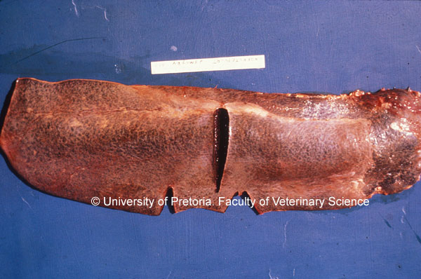 Bovine babesiosis or redwater is a tick-borne disease caused by parasites of the genus Babesia which occur in the erythrocytes of infected cattle. In animals which have died from acute B. Bovis infections there is severe congestion of most organs with serosal petechiae and ecchymoses occuring in many organs. Splenomegaly and hepatomegaly occur. The liver is yellowish brown.