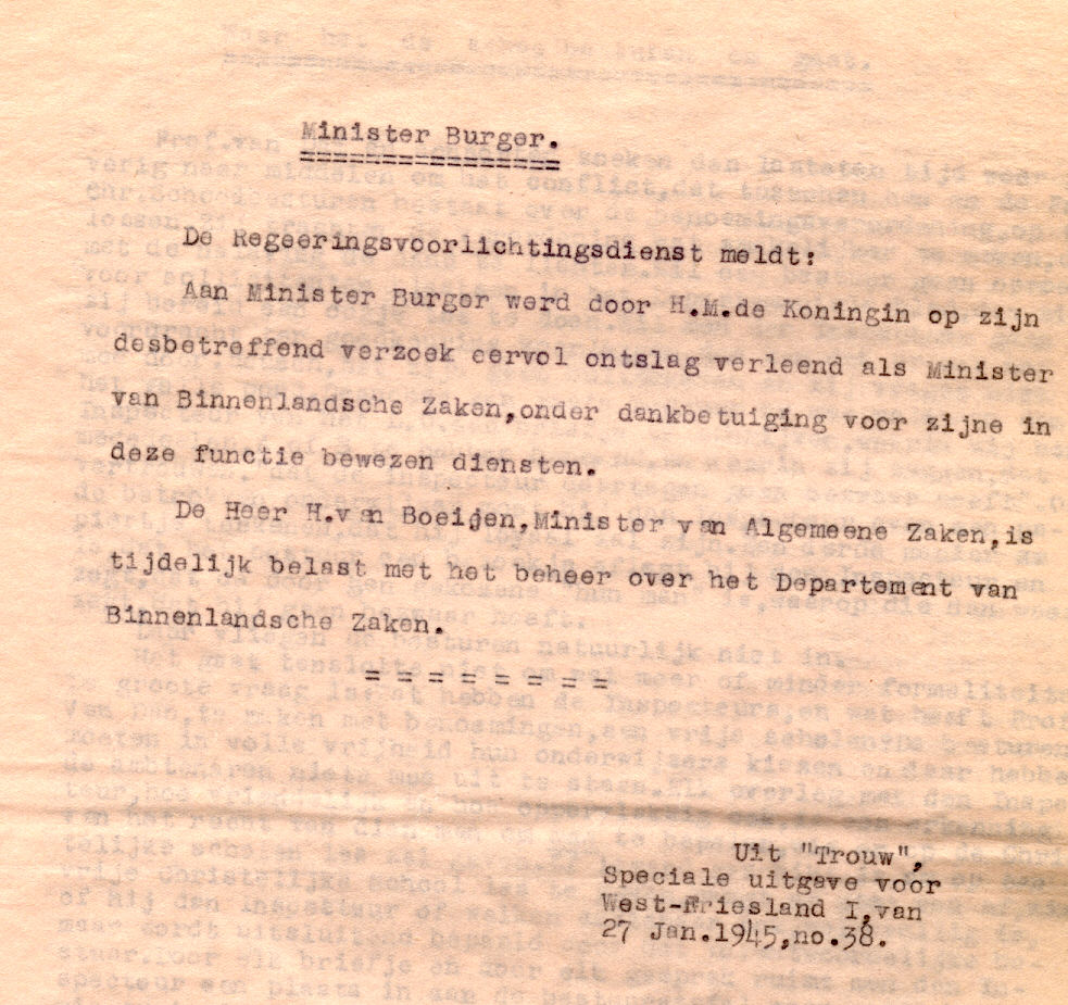 Second World War 1939-1945, Minister Burger, Van Boeijen