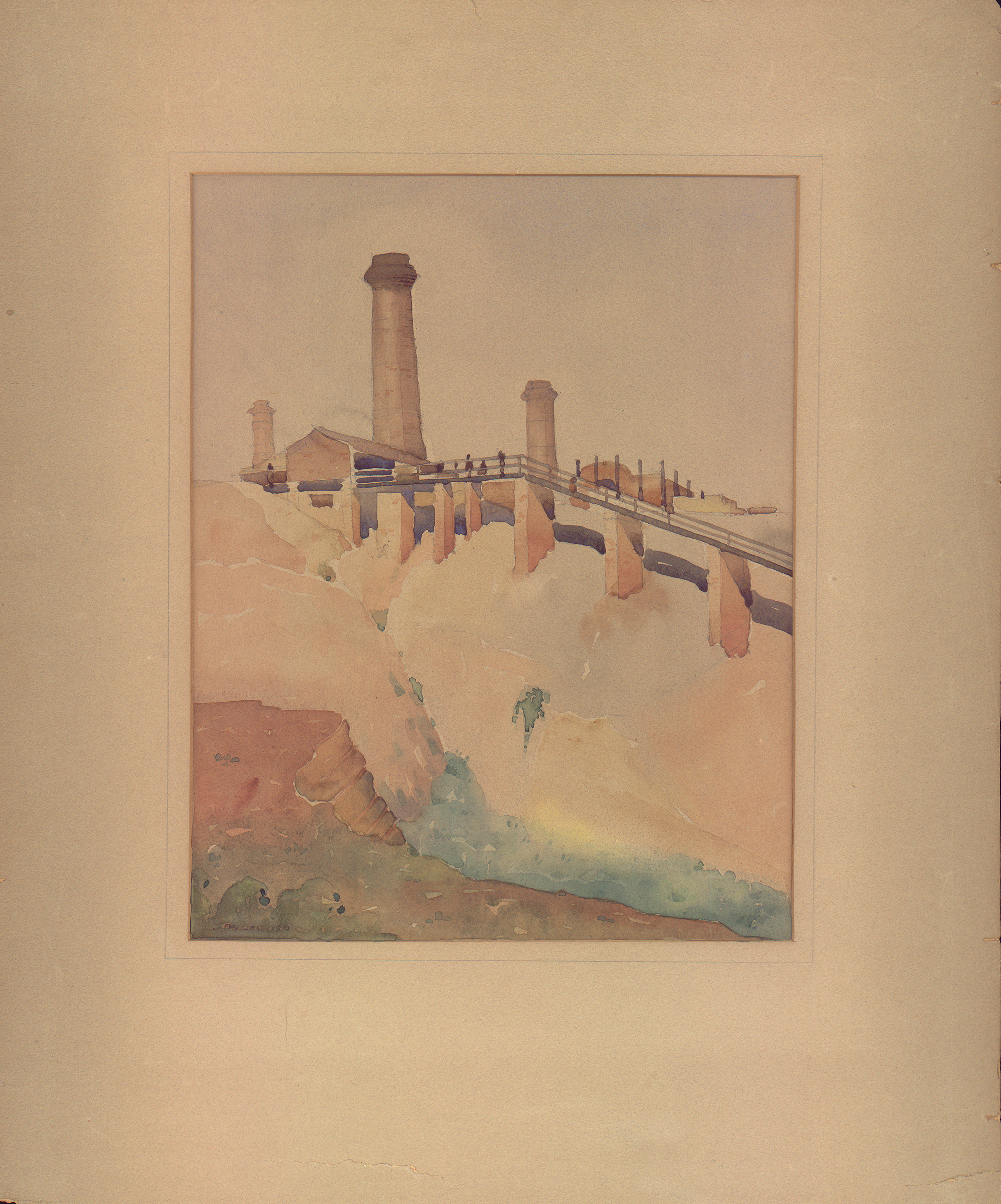 Part of John Fassler's fascination with industrial building and rendering of landscape combined. The influence of Brangwyn's Book of Bridges is evident.
