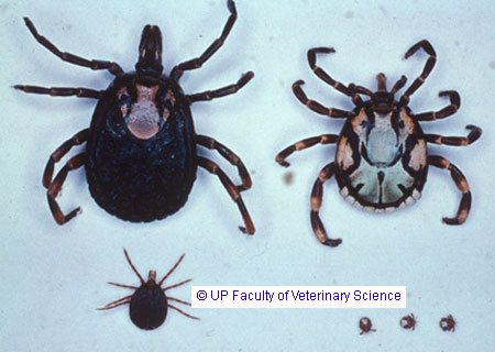 Three stages in the life cycle of the tick Amblyomma hebraeum : male and female adults, a nymph and three larvae