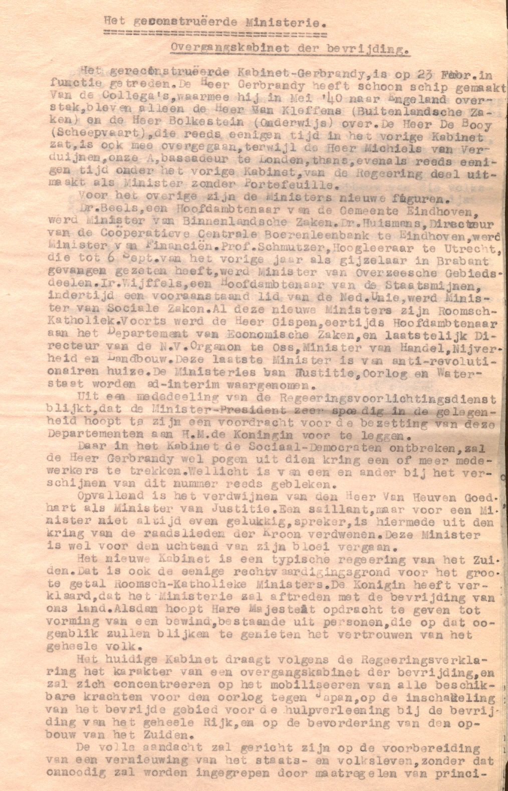 Out of the newspaper "Trouw" landelijk orgaan, third year no 4, March 1945. Original size 285mmX225mm on pink paper. Scanned on HP5300C scanner at 150dpi. 2 pages.