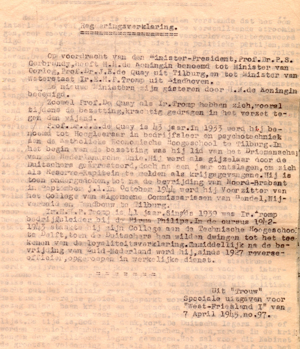 Queen Wilhelmina appointed Dr. J.E. de Quay as Minister of War and Eng. Tromp as Minister of Water Affairs by the request of Prof. P.S. Gerbrandy.