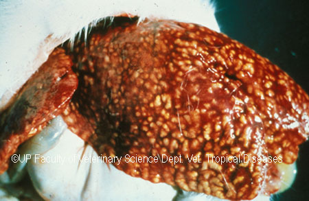The liver is the seat of infection with the Eimeria stiedae parasite in rabbits. The photo show numerous white nodules in a rabbit liver. Each nodule comprises thousands of the various developmental stages of the organism.