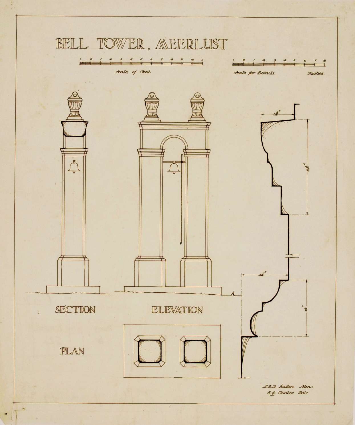 | dc.description.abstract | Plan, elevation and section of the bell tower at the Cape Dutch homestead of Meerlust, measured by L.R.F. Bustin and redrawn by E.G. Tucker for prof. Geoffrey Pearse's book "Eighteenth Century Architecture in South Africa" – see page 44 for a description, and Plate 71 for the drawing. Plate 70 features a photograph of the bell tower and homestead by Arthur Elliot. | en_US |