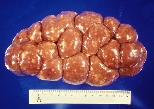 East Coast fever (ECF) : numerous multi-focal whitish nodular lesions in the renal cortex
