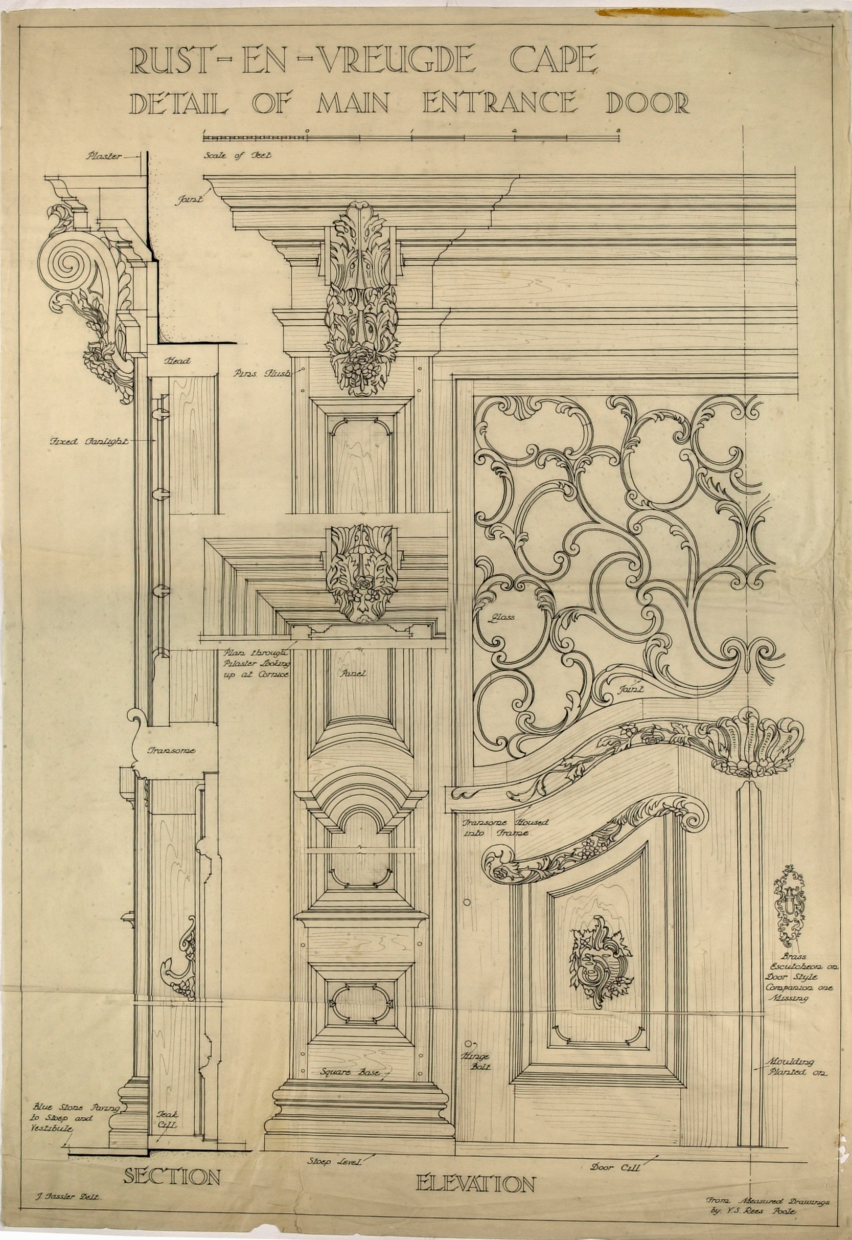 Elevation and section that show in great detail the main entrance door to Rust-en-Vreugde. Done by John Fassler from measured drawings by V. S. Rees Poole, probably for prof. Geoffrey Pearce's book "Eighteenth Century Furniture in South Africa", but never included.