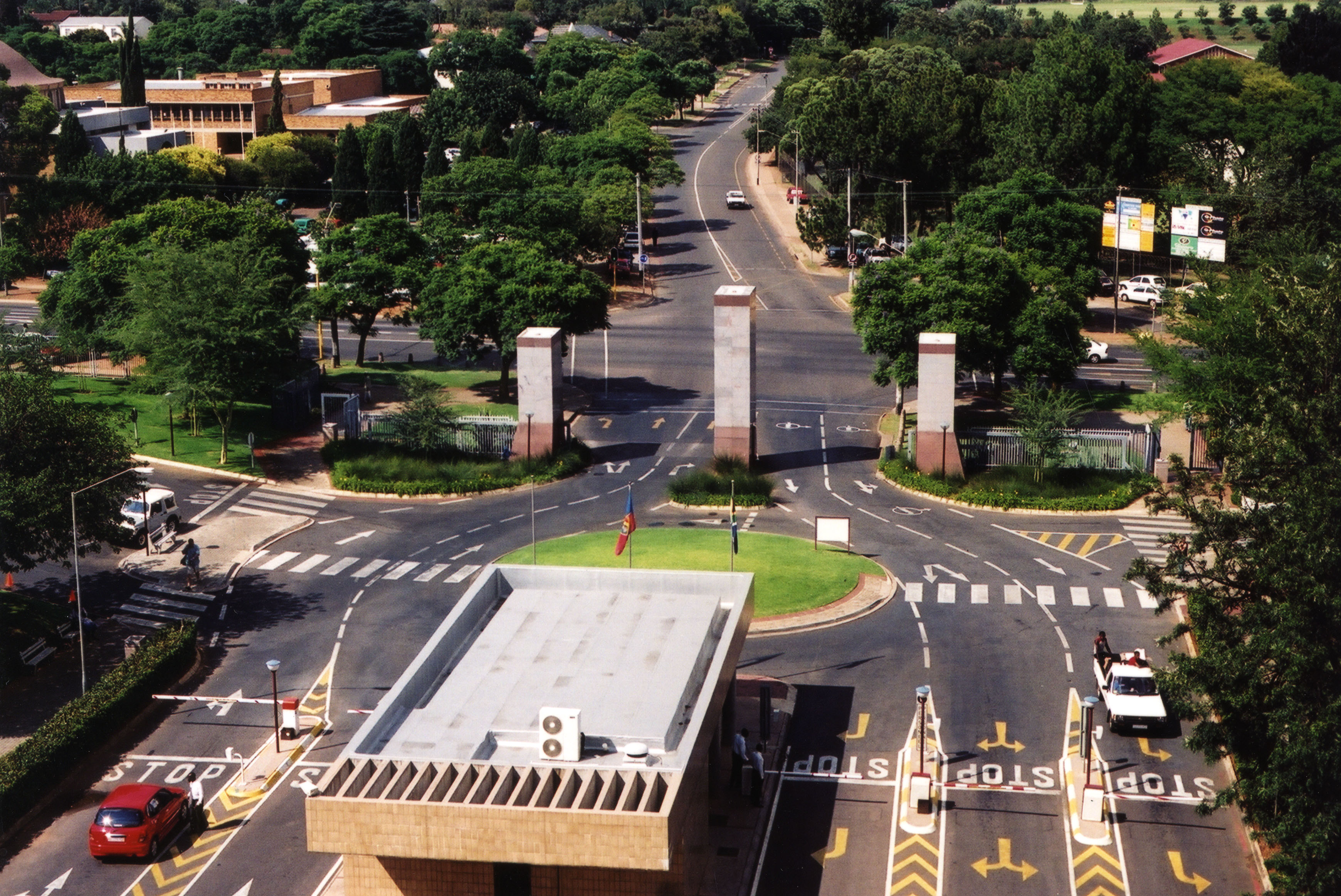 Aerial view of the University main entrance seen from the humanities building, Hatfield Campus, University of Pretoria.