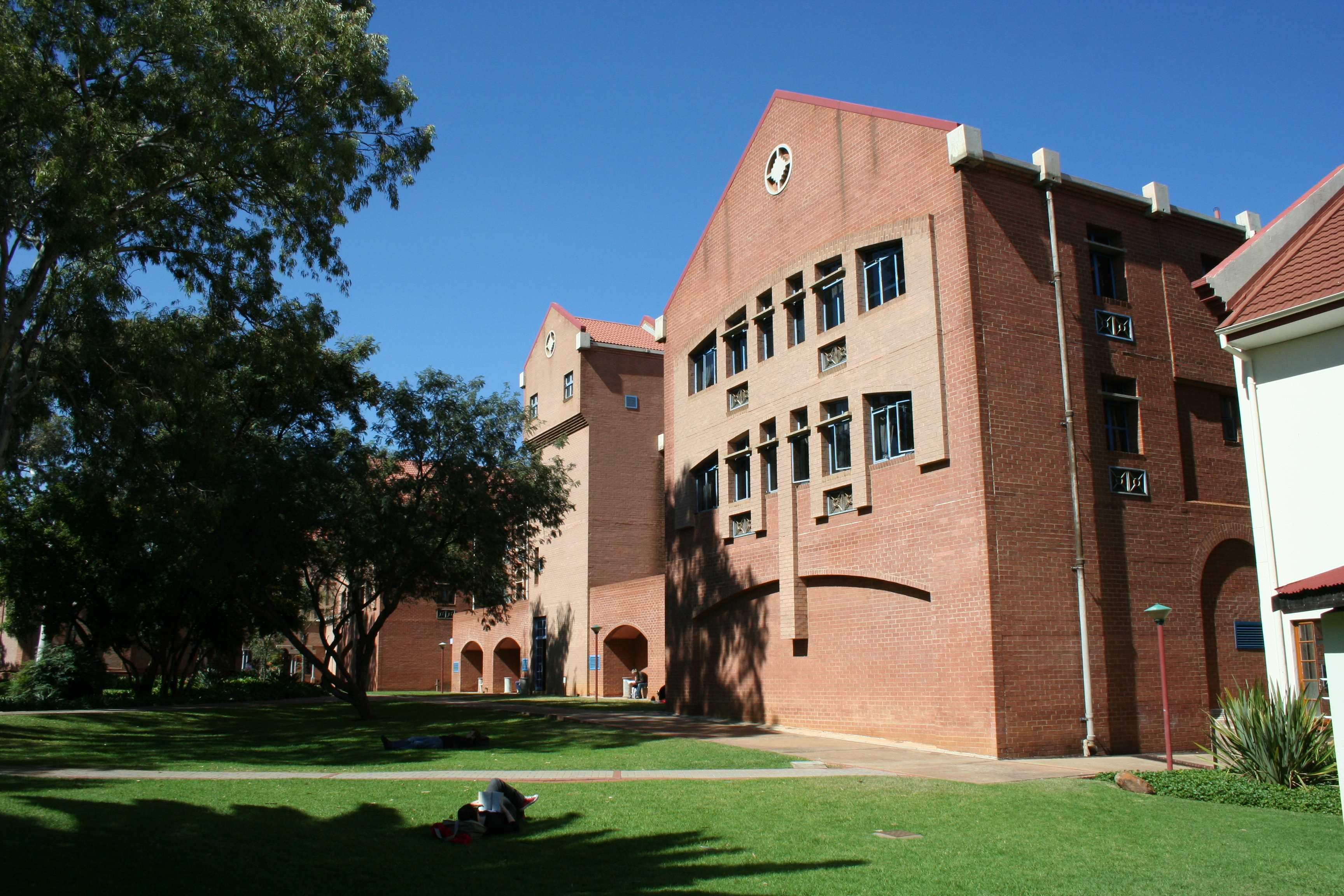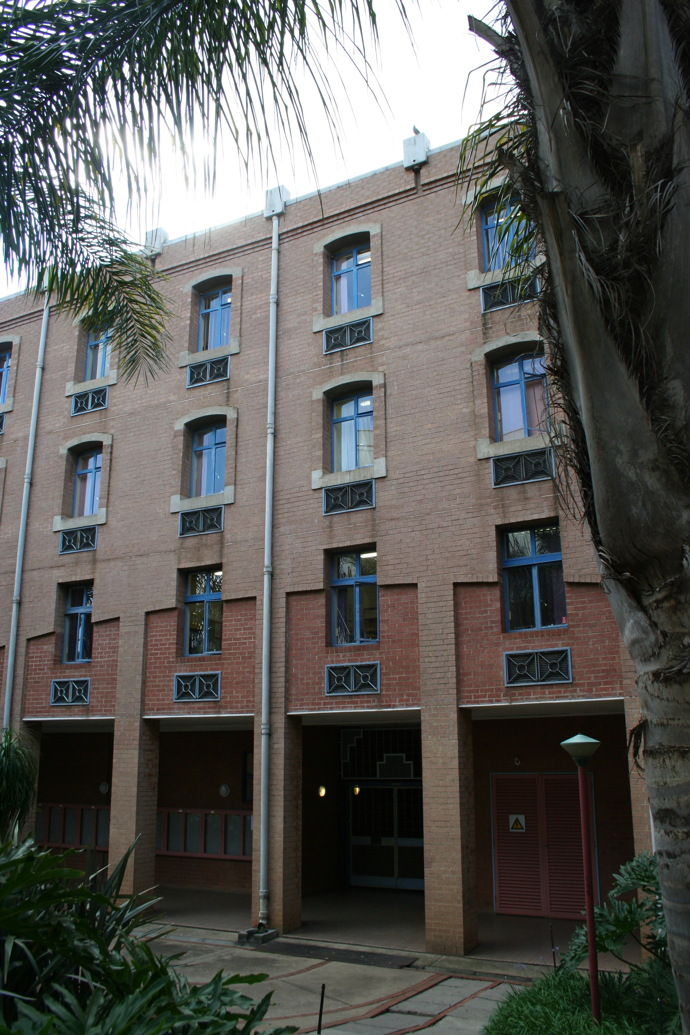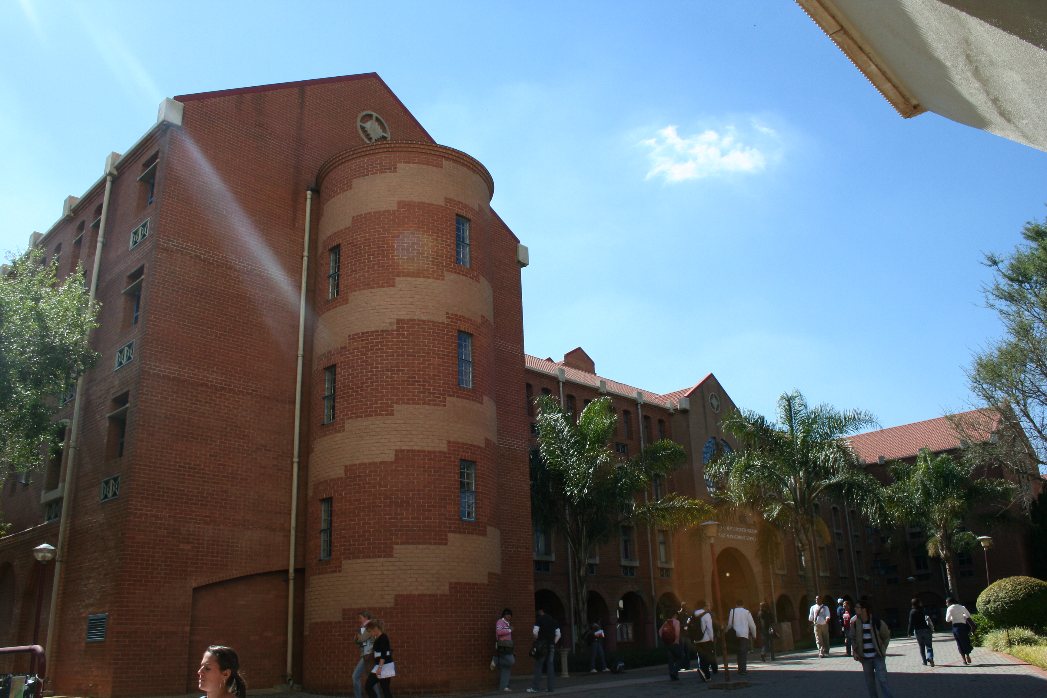 The Faculty of Economic and Management Sciences was granted its own building in the late 1980s. Designed to link the older buildings to the north with the more modern buildings to the south, the long narrow building shows elements of various styles. These include Post-Romanesque Revival, aspects of the Old Arts Building such as the clock tower and the arches and even the Pretoria brick tradition. Samuel Pauw, an alumnus of UP, was the architect responsible for the design. Construction of the building was done in three phases – the first two were completed in August 1989 and the last phase in July 1990. The main building was opened by President F W de Klerk in March 1991. The building incorporates the Sanlam Auditorium which is used as a conference venue and houses the SRC chambers.