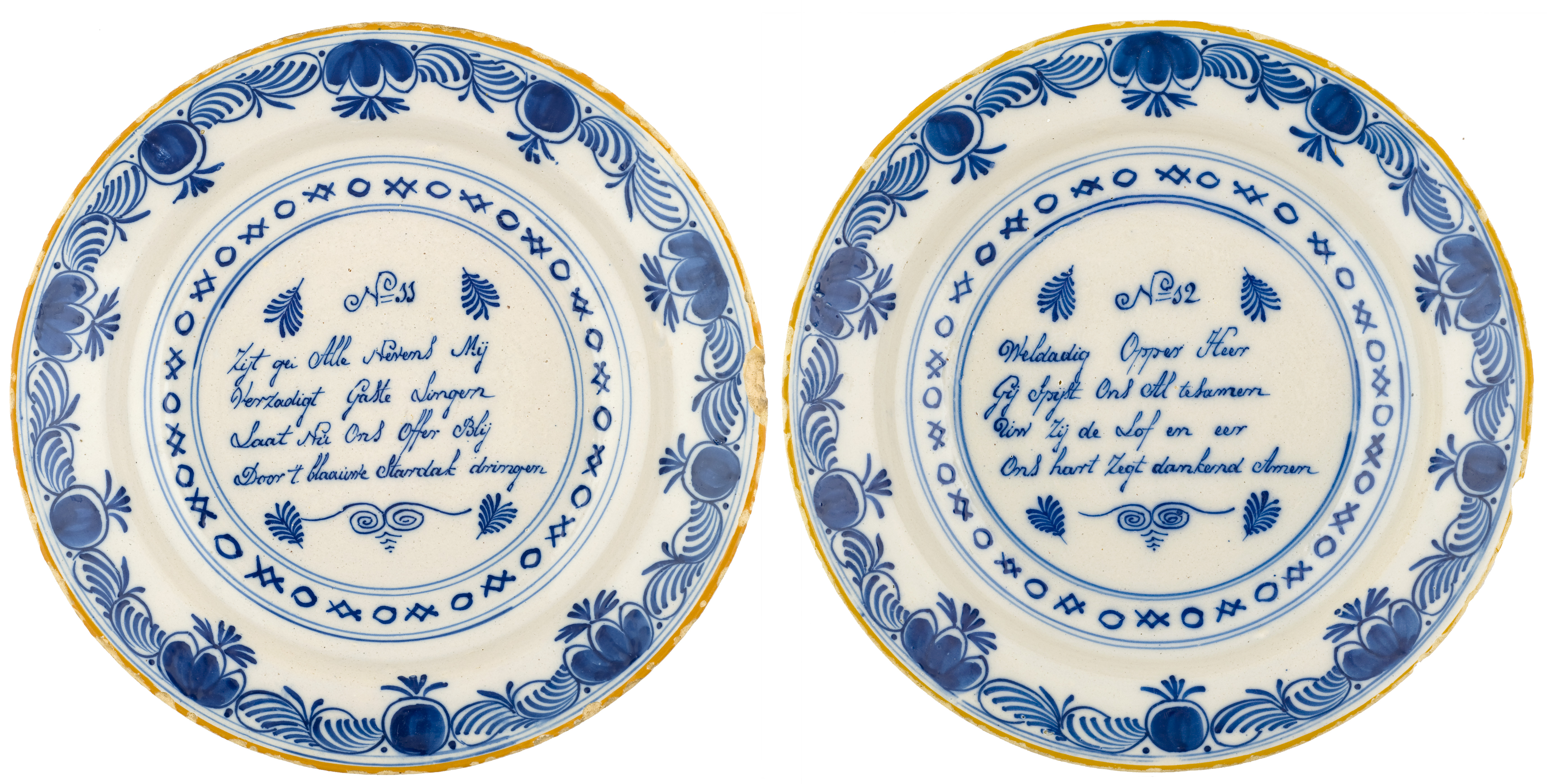 Both these tin-glazed earthenware Delft plates are similarly decorated with a floral and fruit scroll border on the rim and a prayer in Dutch in the centre. The one plate has Prayer No. 11 for after the meal which reads: “Zijt gei Alle Nerens Mij / Verzadigt Gaste Singen/ Laat nü Ons Offer Blij / Door’t blaaute Stardak dringen” (You are always near me / Fed guests sing / Let our offering remain / and penetrate the blue starry sky) and the other No. 12 a prayer for before the meal, which reads: “ Weldadig Opper Heer / Gij Spijst Ons Al tesamen / Uw Zij de Lof en eer / Ons hart Zegt dankend Amen” (Benevolent sovereign Lord / You feed us all / to You the praise and honour / our hearts say thankfully amen”).