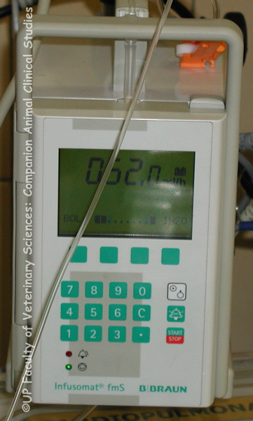 PHOTOS 1-3: A syringe driver is a type of infusion pump that are used in hospitals to administer small amounts of medication to a patients. PHOTOS 4-5: Infusion pumps are used in the ICU to administer fluid or medication directly into a patient’s circulatory system by means of a high but controlled pressure. The user simply enters the amount of fluid and the time the fluid needs to be delivered. PHOTO 6: Ventilators are used to assist critically ill patients with breathing. The goal is to provide adequate lung exchange without causing ventilator-induced lung injury. Three main breath patterns are recognised: continuous mandatory ventilation, continuous spontaneous ventilation and intermittent mandatory ventilation. Animals must be very carefully monitored during ventilation. PHOTO 7: A monitor allows the clinician to constantly monitor a patient's heart rate, blood pressure and other physiological components that provides information on the current state of the patient. PHOTO 8: In paediatrics incubators are used for sick puppies and kittens for external warming, oxygen supplementation and air humidification. Incubators can be used in critical care to increase the inspired oxygen concentration and allow observation and treatment of the patient at the same time. Incubators also humidify inspired gases and warm the patient. PHOTO 9: The veterinary laboratory is a place that is equipped to do diagnostic tests, to determine the severity of diseases and to assess patients’ responses to treatments.