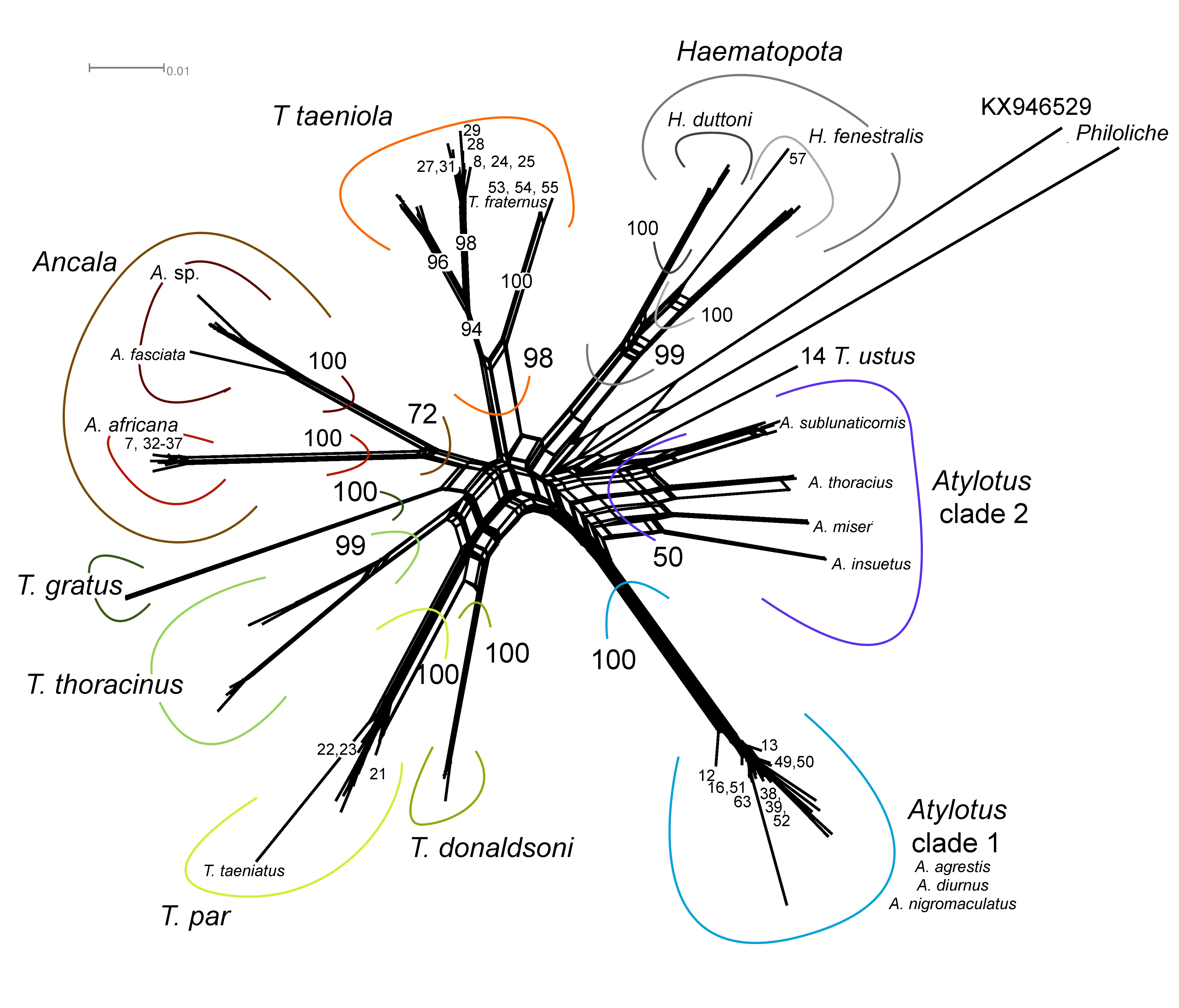 | dc.description | Additional file 1: Figure S1. An uncorrected p-distance data-display network, using all characters recovered from SplitsTree using the Tabanidae cox1 data. Bootstrap (bs) support calculated from 1000 replicates is indicated for the various groupings. The double-digit numbers (intuitional voucher numbers) on the tips of the network represent the sequences from this study. | en_ZA |