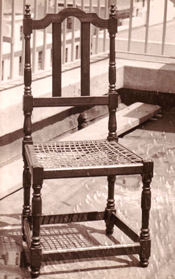 Photograph depicting a late 17th century chair with no armrests and a thonged seat of "riempies". It has a shaped top rail, uprights with finials, peg top turned legs and a split back splat.