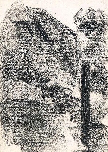 Charcoal sketch by Reus of a pathway across water with a pole to the right. A large farm style house in the background.