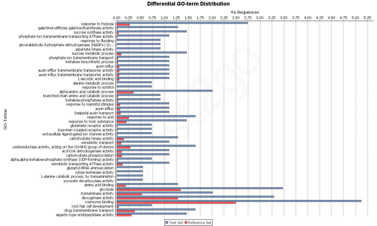 Additional file 5: Figure S2. Differential GO-term distribution after enrichment analysis for sequences up-regulated in the 22HF vs. 22HI comparison. The percentages of sequences associated with GO terms showing over-representation in the 22HF vs. 22HI comparison compared to the reference set consisting of all sequences on the array (FDR < 0.05). Only transcripts showing significant differential expression (log2FC > 1, adj. P-value < 0.05) were included in the analysis.