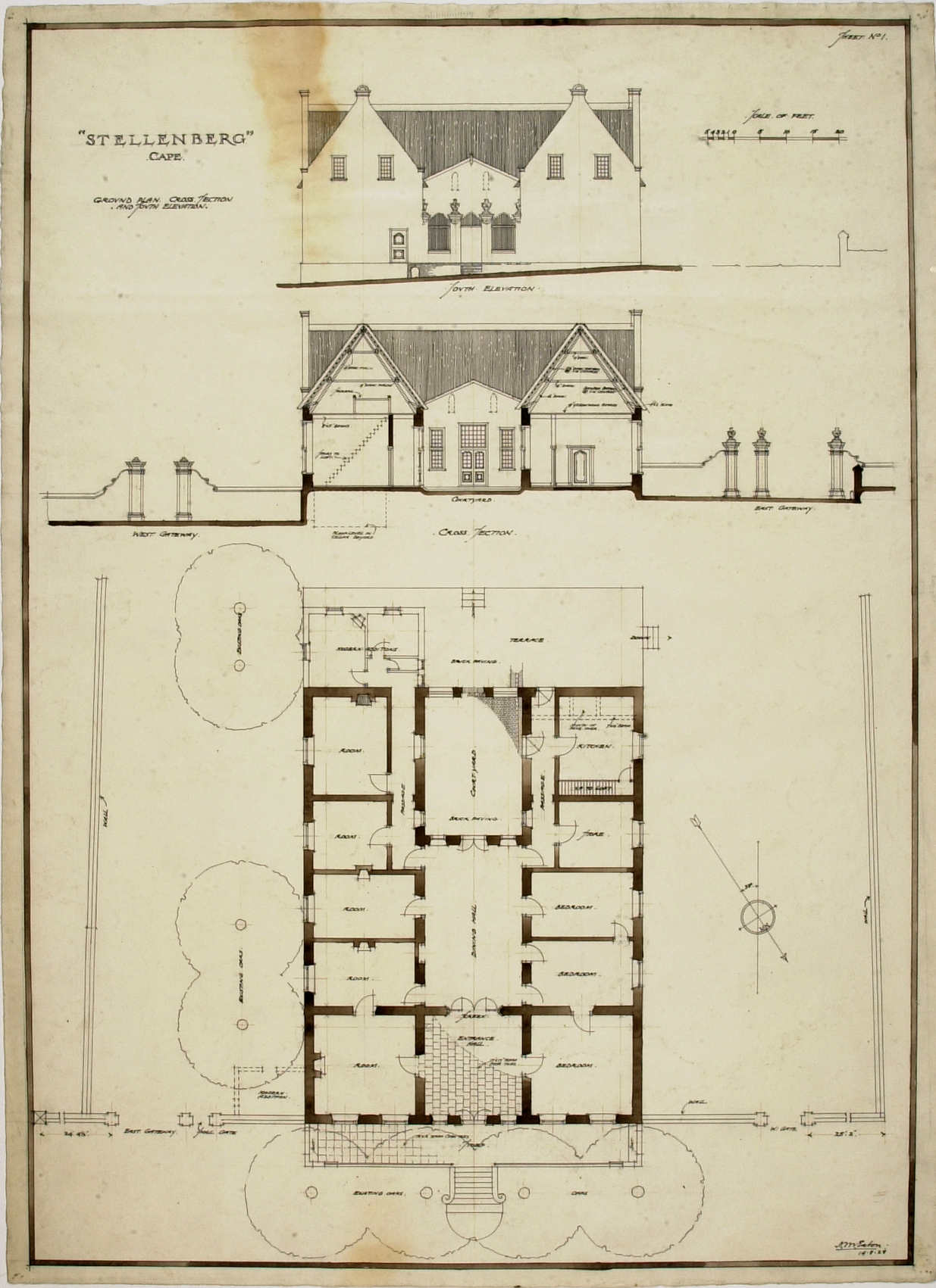 Ground plan, cross section and south elevation of the Stellenberg Cape Dutch homestead near Wynberg, Cape Town. Drawn by Norman Eaton for prof. Geoffrey Pearse's book "Eighteenth Century Architecture in South Africa" – see page 44 for a description, and Plate 55 for the drawing. The U-shaped thatched house features straight gables.