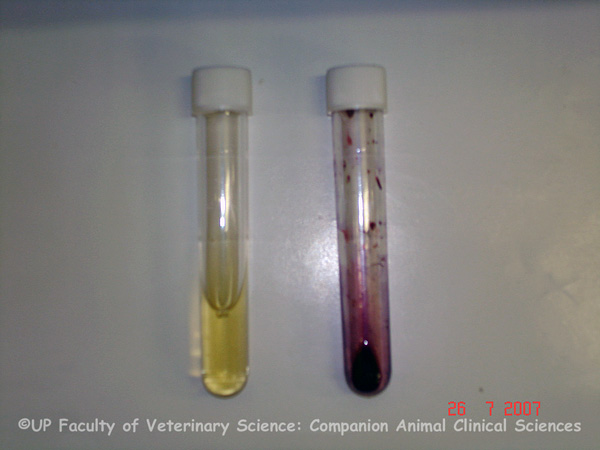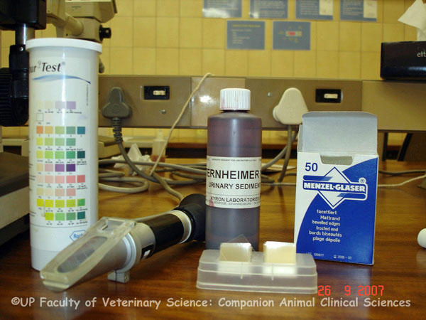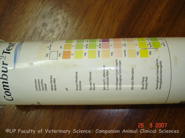 PHOTOS 1-3: Urine samples are important diagnostic tools. Urine can be collected by free catch collection, manual compression of the urinary bladder, cystocentesis or catheterization. Cytological examination of urine can be used to diagnose several pathological conditions. The Sternheimer – Malbin stain is compounded of gentian violet and safranin and is used for the examination of urinary deposits. It is useful in the diagnosis of urinary tract infections and for the differentiation between pyelonephritis and cystitis. The Sternheimer – Malbin stain divides urinary leucocytes into two types of which the nuclei stain either dark reddish purple or pale blue. Cells with blue staining nuclei are characteristic of pyelonephritis. PHOTOS 4-5: Once urine has been collected it should be examined within 30 minutes. Delay of examination may allow the growth of contaminating bacteria and a change of urine pH. Delay in examination will also allow time for fragmentation and disruption of cells and loss of casts. If a delay is unavoidable the urine sample should be refrigerated. The urine sample is centrifuged and the pellet resuspended. A few drops of stain can be added. Staining of urine with Methylene blue or the Sternheimer – Malbin stain facilitates differential staining of cells and nuclei. A drop of the resulting fluid is placed on a clean glass slide and a coverslip is placed over it. Bright field microscopic evaluation of urine sediment is done with reduced illumination. The chemical dipstick analysis is performed on urine at room temperature before centrifugation. The colour reactions on the dipstick should be read within the specified time interval as these reactions are a function of time. PHOTO 6: The chemical dipstick analysis is performed on urine at room temperature before centrifugation. The colour reactions on the dipstick should be read within the specified time interval as these reactions are a function of time. The chemical reagent dipstick colour reactions are influenced by urine concentration and are subject to limitations. The pH is read immediately after dipping. The pH of urine is usually acidic. The dipstick measures protein, glucose, ketones, blood, bilirubin and urobilinogen in urine.