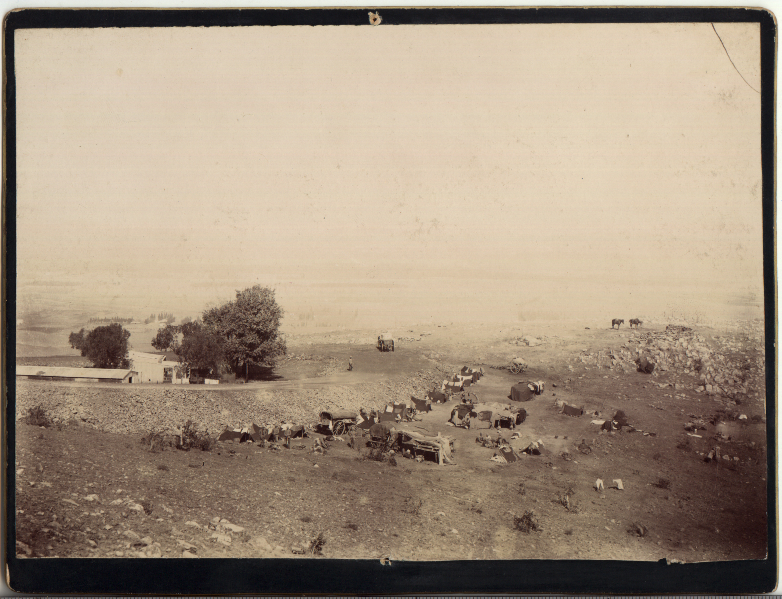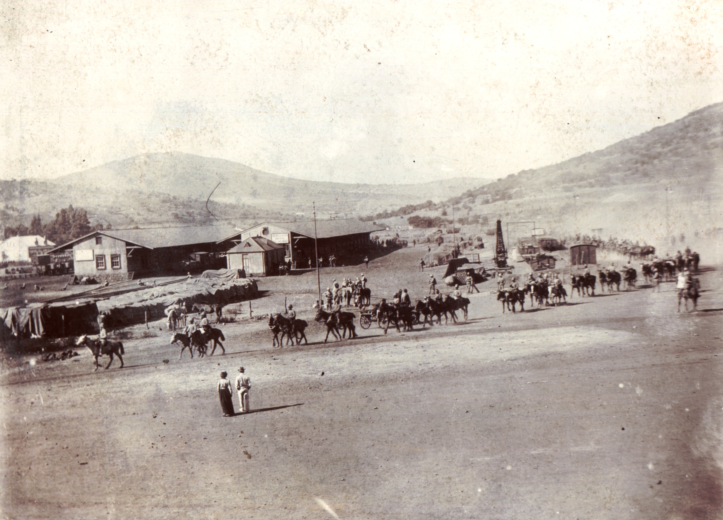 Boer, Field, Horses, Trees, Officer, House, Building, Water pump, Mountains, Field, Construction, Explosion, Horse carriage, Camp